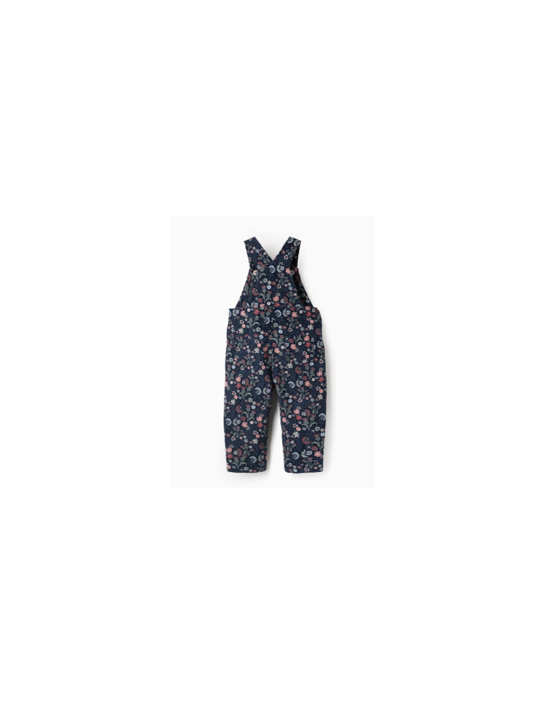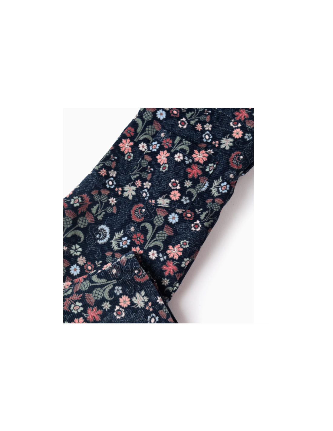 Peto azul oscuro de pana 100 % algodón, con motivo floral multicolor. Tirantes ajustables. Cintura con pinzas. Bolsillos en la parte posterior. Un patrón original, a juego con los tonos de invierno.
