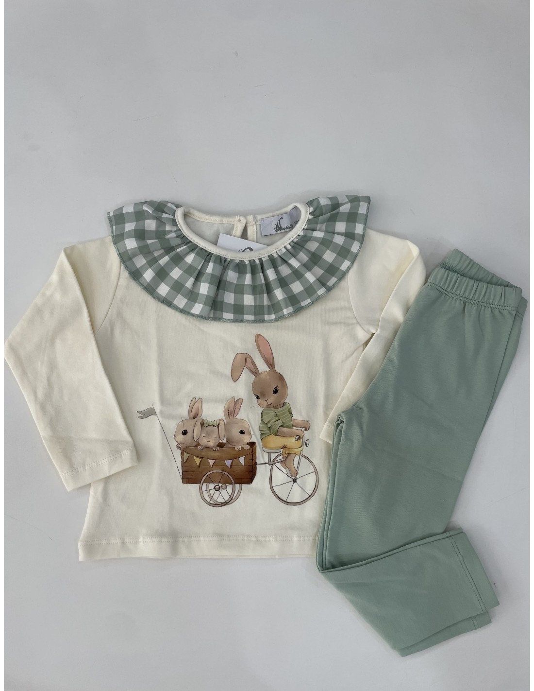 Conjunto legins verde con camiseta a juego y cuello volante en cuadros vichy verde.
