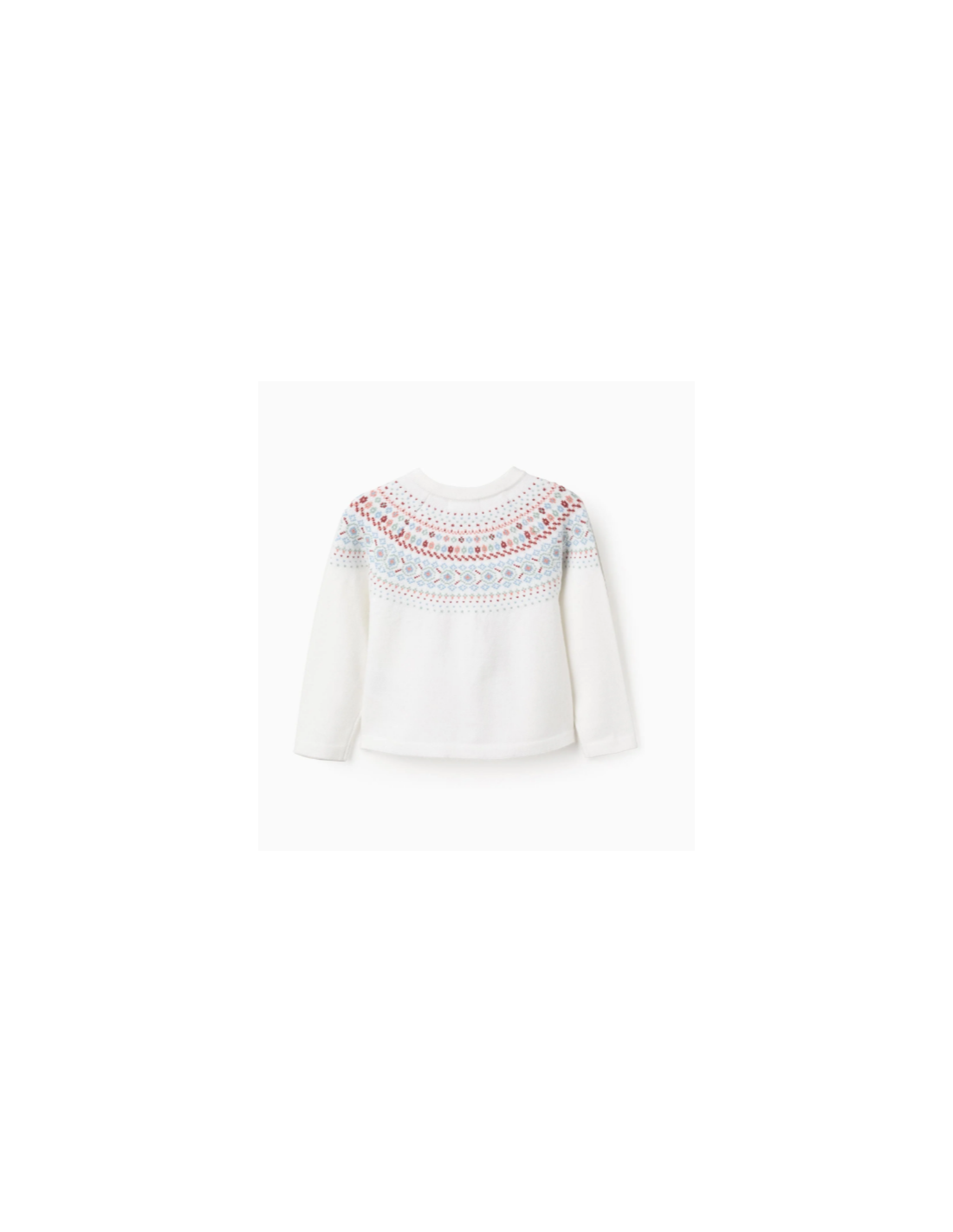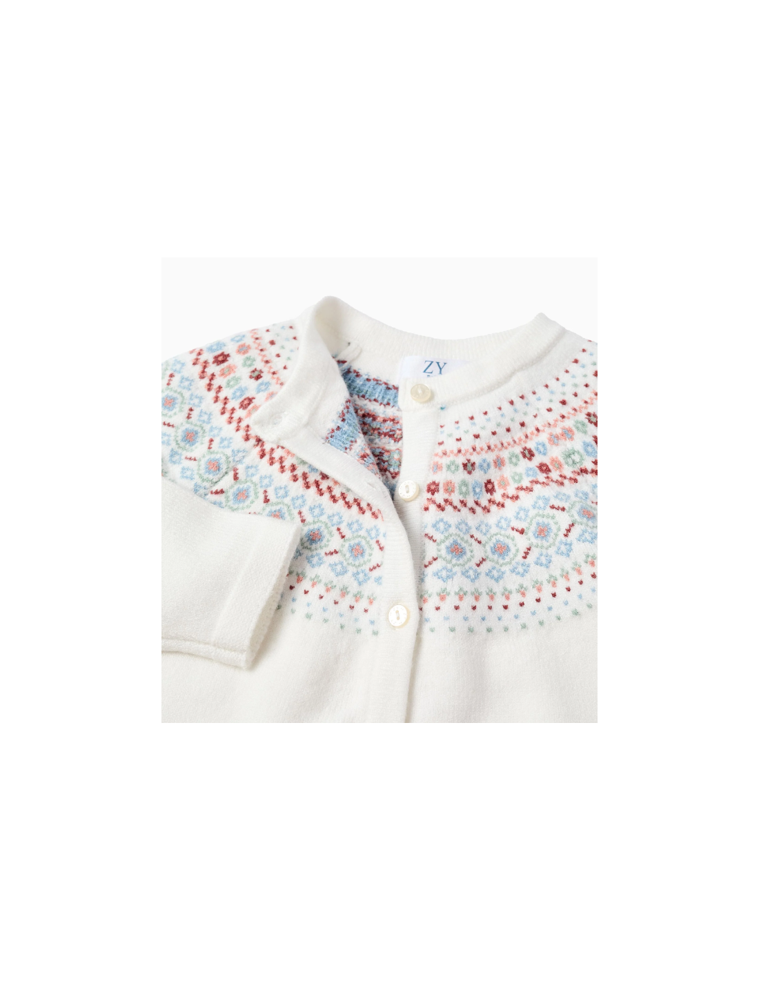 Cárdigan de punto blanco para bebé niña, con jacquard multicolor en el pecho y alrededor de los hombros. Corte evasé. Una prenda suave y acogedora con un toque tradicional.