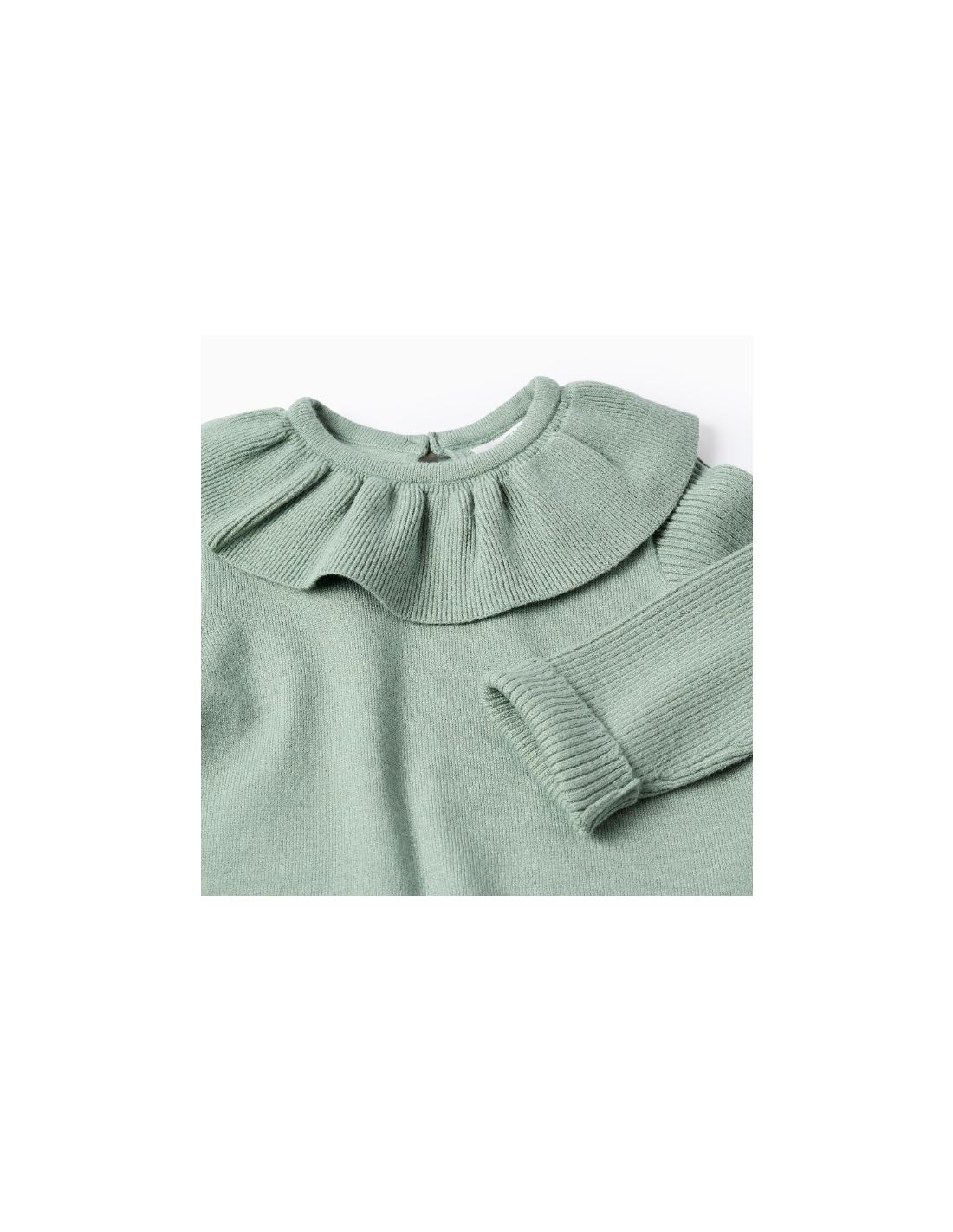 Jersey de punto verde para bebé niña, suave y flexible. Cuello de volantes. Botón en la espalda para vestir fácilmente. Mangas acanaladas. Puños y base con efecto ondulado. ¡Un esencial del armario, versátil y atemporal!
