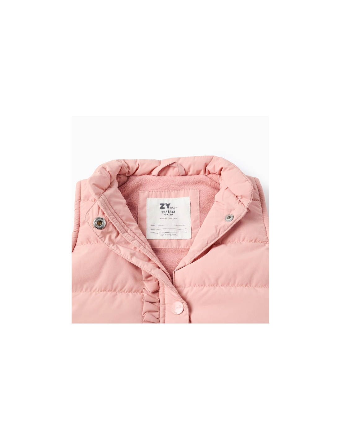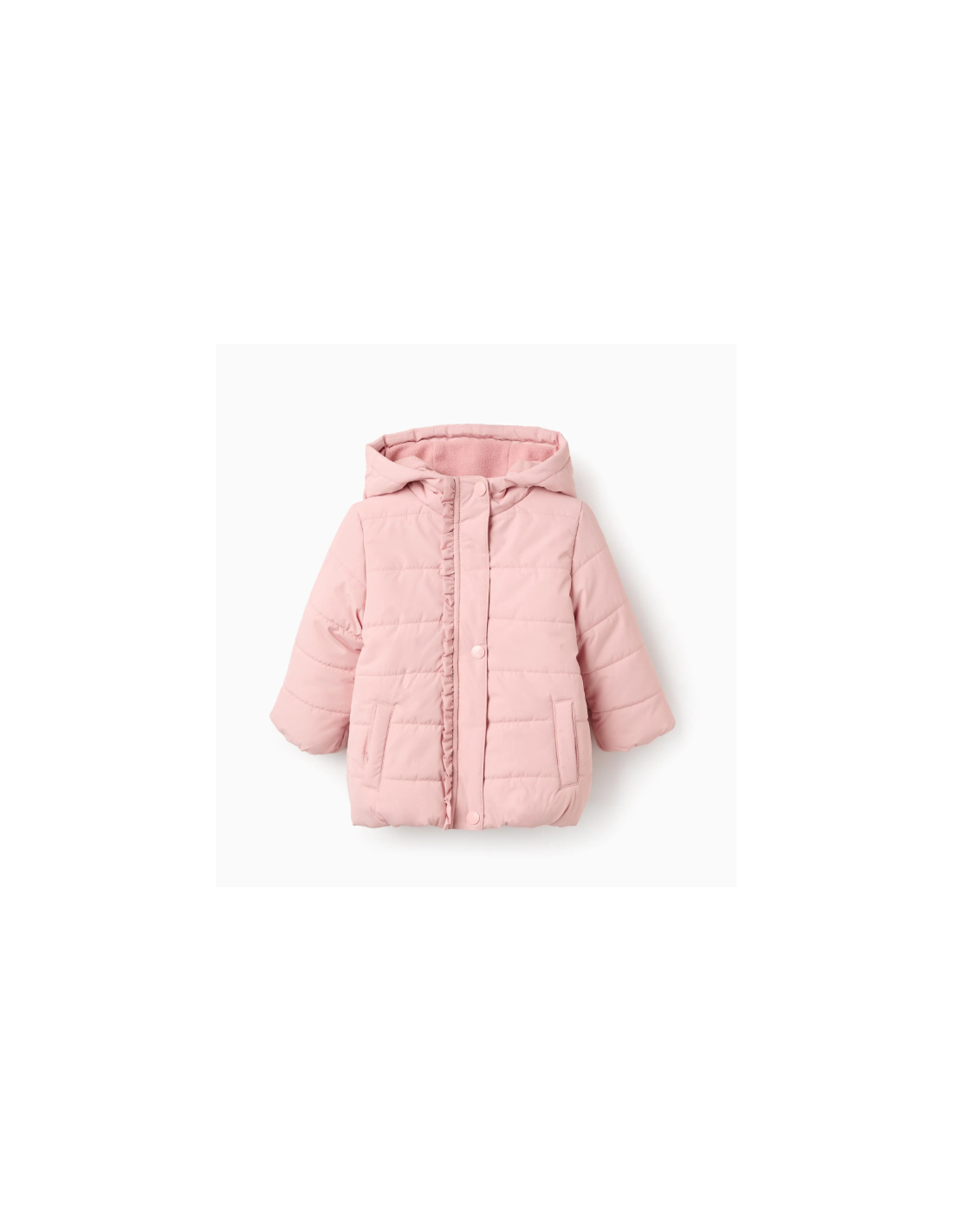Chaqueta acolchada rosa para bebé niña, con capucha y forro polar para mayor calidez. Detalle de hoja en el centro. Bolsillos laterales. Se cierra con cremallera y automáticos para vestirla fácilmente. Bajo y puños ligeramente elásticos para un ajuste perfecto. Etiqueta interior para la identificación del niño. Una prenda versátil y cómoda, perfecta para el invierno. We Care: esta prenda está rellena de poliéster reciclado.
