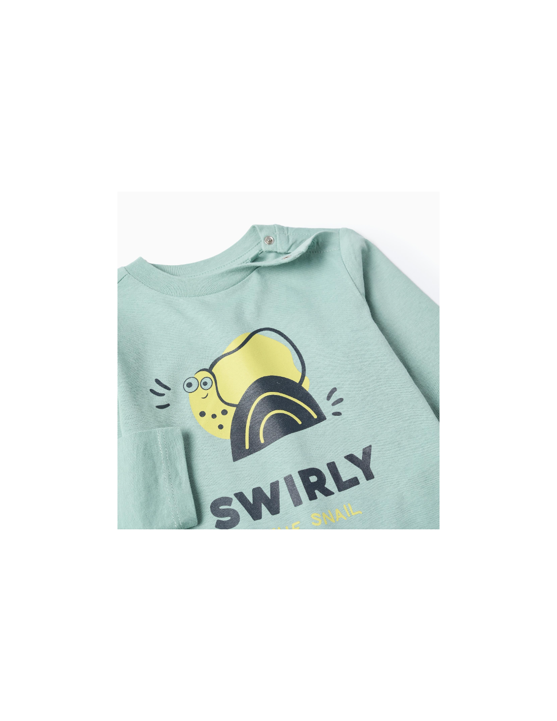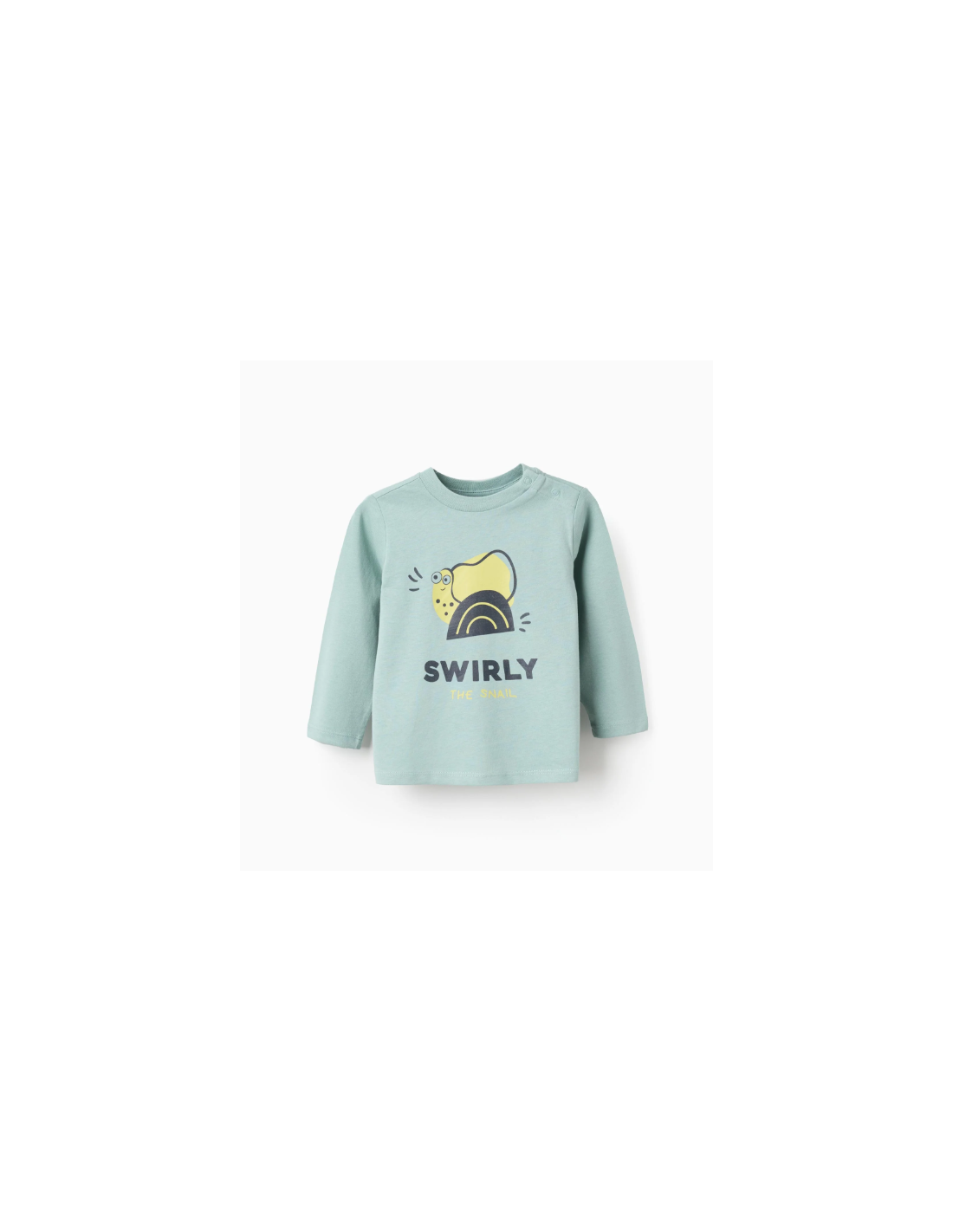 Camiseta verde agua de manga larga para bebé niño, 100% algodón. Estampado de caracoles en la parte delantera. Botones automáticos en el hombro para vestirla fácilmente. Etiqueta interior impresa para no irritar la piel. Un estampado divertido para el día a día. We Care: artículo certificado Oeko-Tex Standard 100, que garantiza la ausencia de sustancias nocivas o irritantes para la piel.