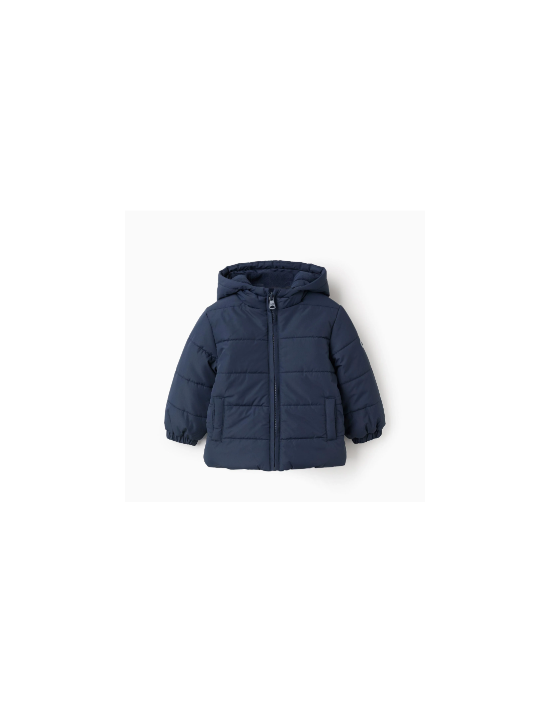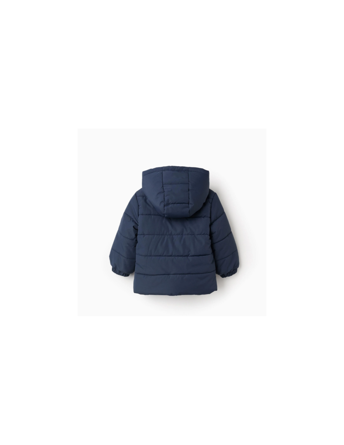 Chaqueta acolchada azul oscuro para bebé niño, con capucha y forro polar para mayor calidez. Bolsillos laterales. Cierre con cremallera para vestirse fácilmente. Puños elásticos para un ajuste perfecto. Etiqueta interior para la identificación del niño. Una prenda versátil y cómoda, perfecta para el invierno. We Care: esta prenda está rellena de poliéster reciclado.