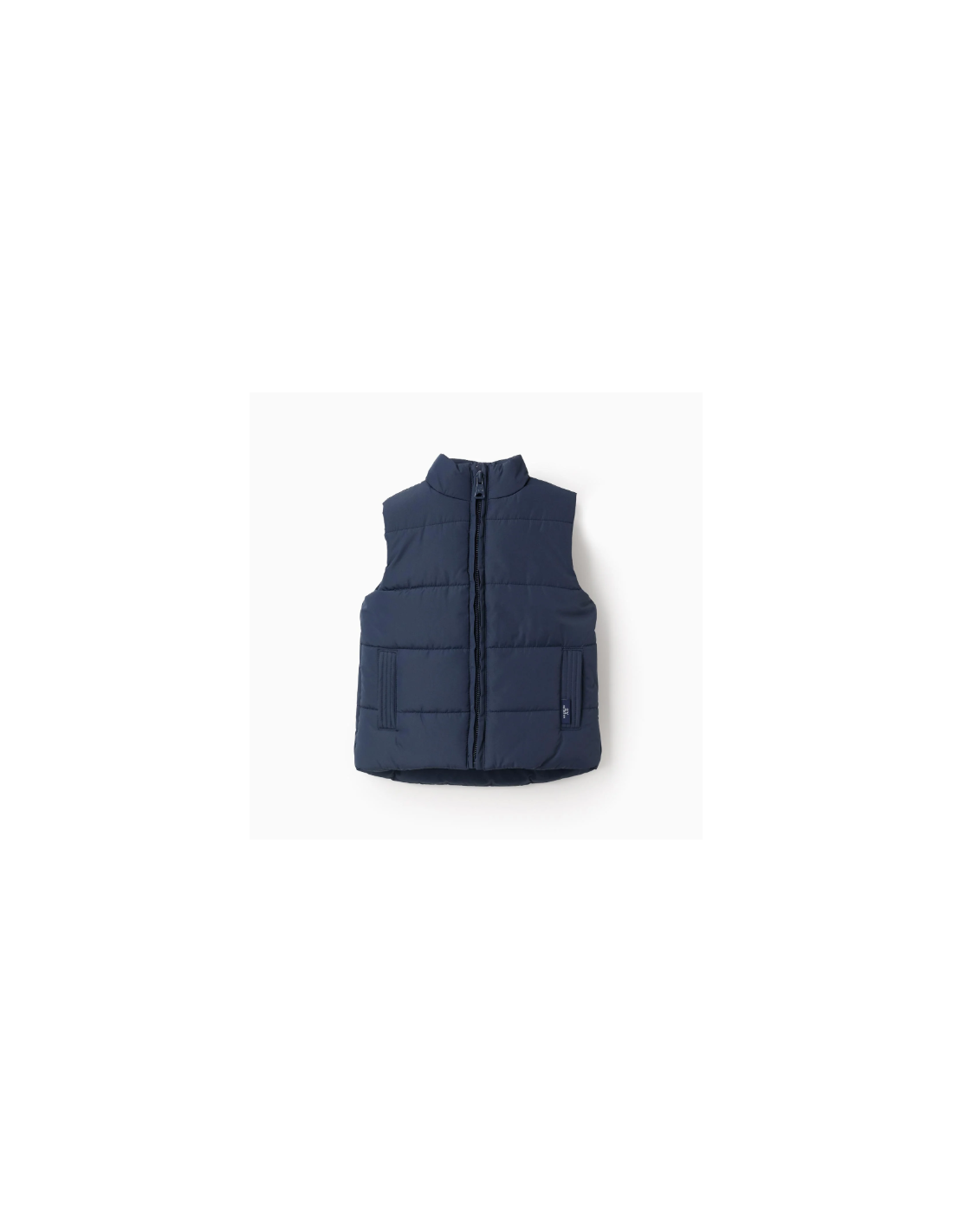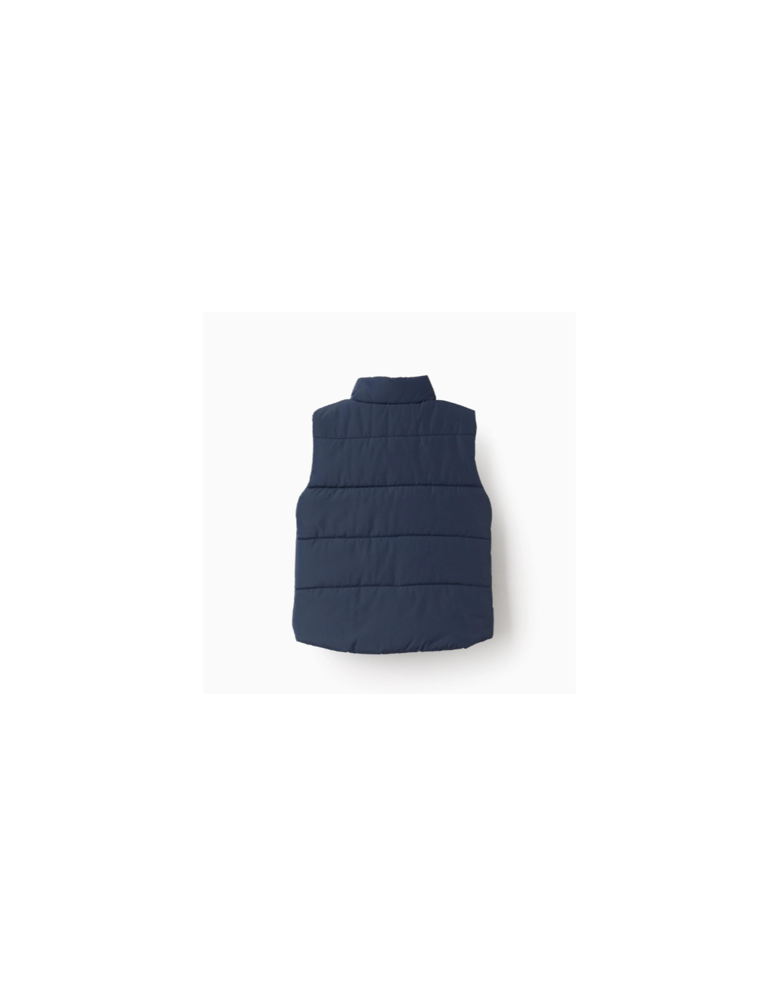 Chaleco acolchado azul oscuro para bebé niño, con forro polar para mayor calidez. Cuello semialto. Cierre con cremallera para vestirlo fácilmente. Bolsillos laterales. Etiqueta interior para el DNI del niño. Una prenda versátil y cómoda, perfecta para los días más frescos. We Care: esta prenda está rellena de poliéster reciclado.