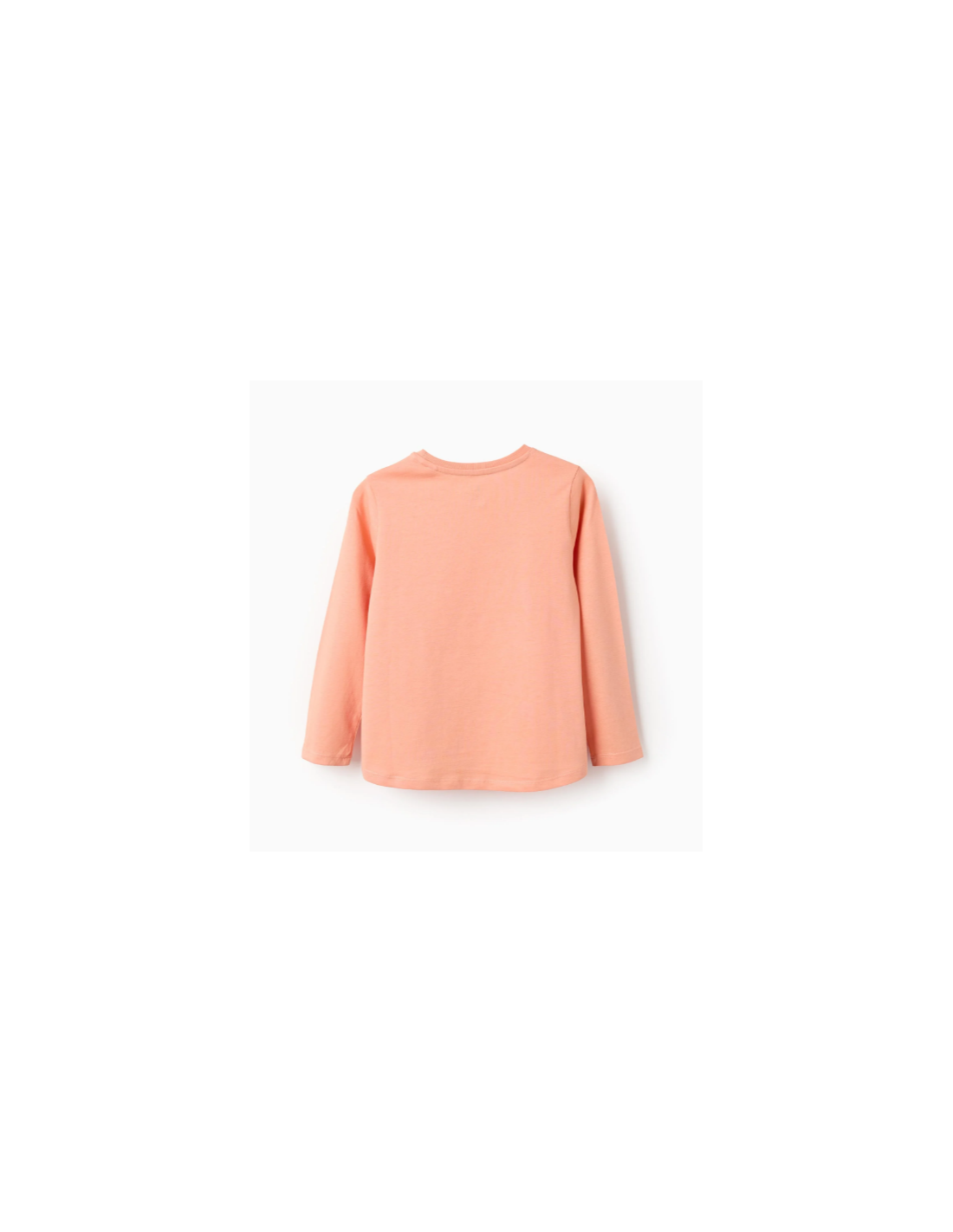 Camiseta de manga larga naranja para niña, 100 % algodón. Estampado frontal en relieve. Etiqueta interior estampada para no irritar la piel. Corte evasé y bajo ligeramente asimétrico. ¡Para los looks de todos los días! We Care: artículo con certificado Oeko-Tex Standard 100, que garantiza la ausencia de sustancias nocivas o irritantes para la piel.