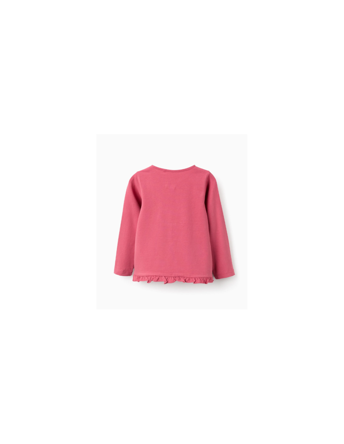 Camiseta rosa oscuro de manga larga para niña, en algodón con un toque de elástico para mayor comodidad y libertad de movimientos. Estampado delantero y volantes en el bajo. Etiqueta interior estampada para no irritar la piel. Corte evasé. Elegante y versátil, ¡ideal para los looks de diario!