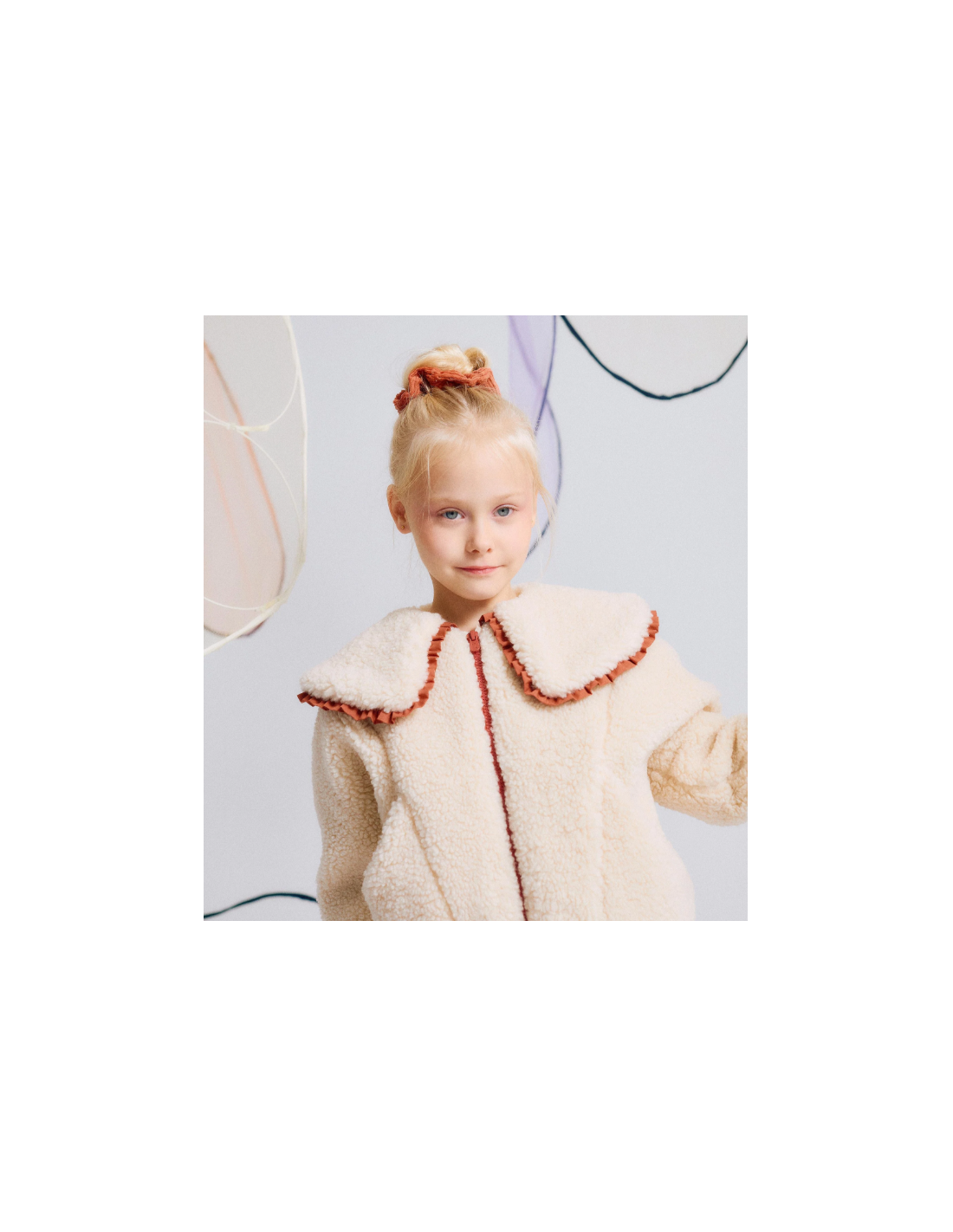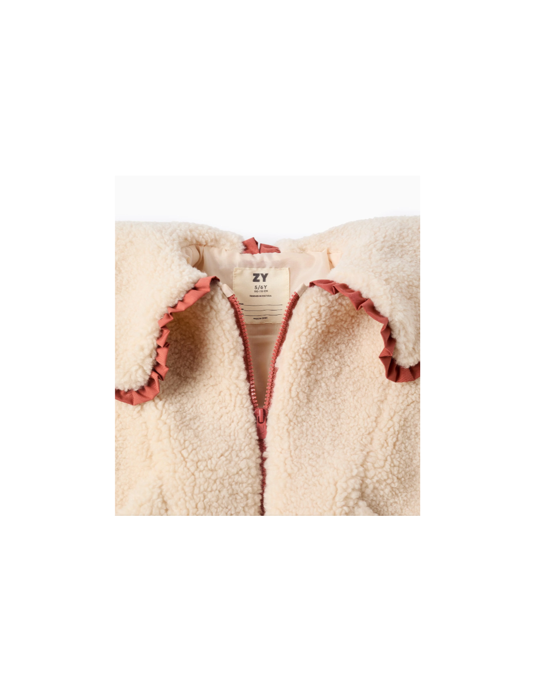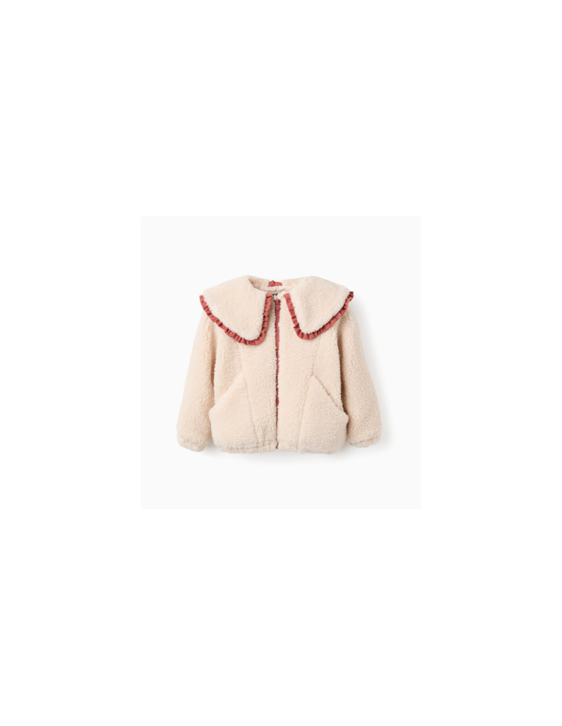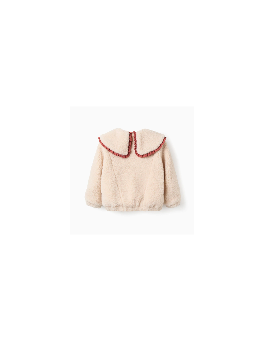 Chaqueta de sherpa beige para niña. Cuello maxi con contorno de volantes en color contraste. Puños y base ligeramente elásticos para un ajuste perfecto. Bolsillos frontales abiertos. Etiqueta interior para poner el nombre de la niña. ¡Un abrigo de estilo boho chic, para looks originales!
