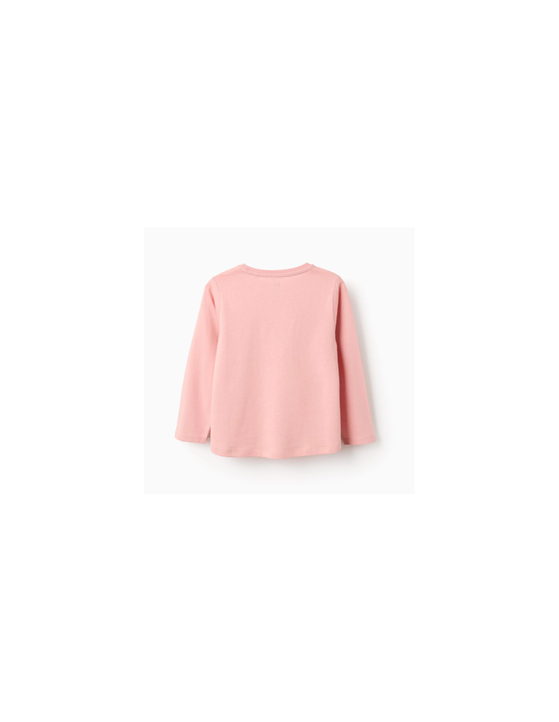 Camiseta de manga larga rosa para niña, 100 % algodón. Estampado frontal en relieve. Etiqueta interior estampada para no irritar la piel. Corte evasé y bajo ligeramente asimétrico. ¡Para los looks de todos los días! We Care: artículo con certificado Oeko-Tex Standard 100, que garantiza la ausencia de sustancias nocivas o irritantes para la piel.