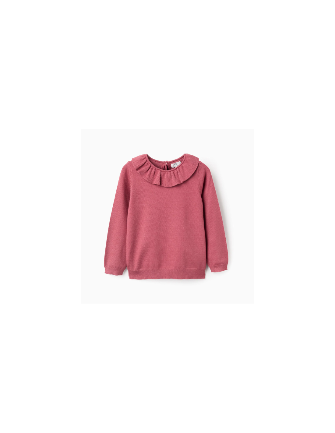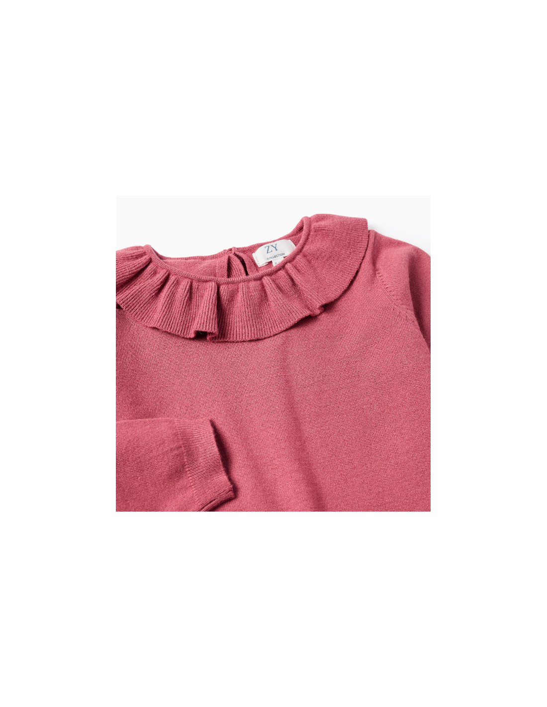 Jersey de punto fino rosa para niña, con cuello de volantes. Extremos acanalados para un ajuste perfecto. Botón en la espalda para vestir fácilmente. Una opción suave, cómoda y versátil.