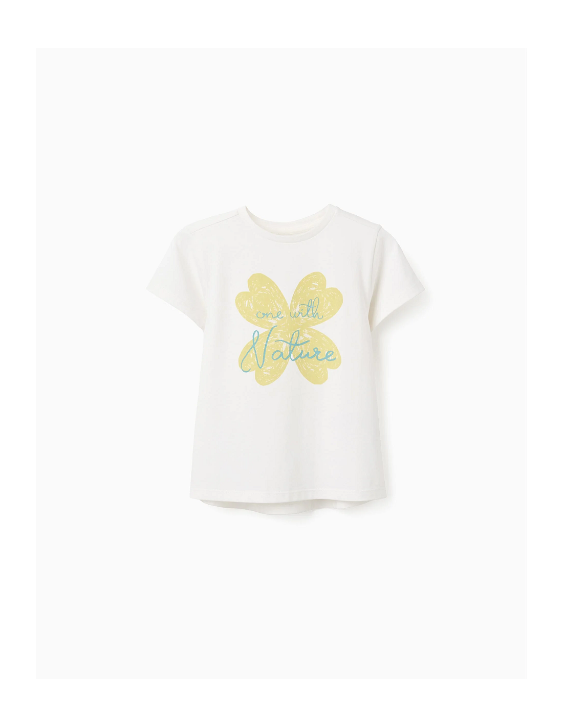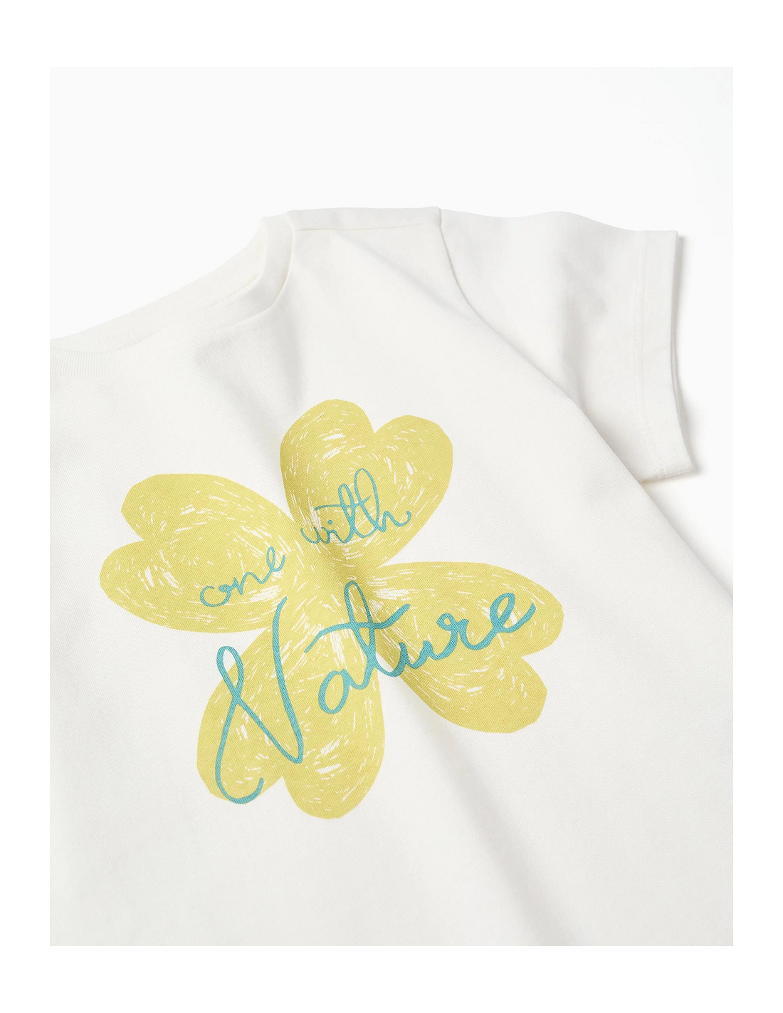 Camiseta blanca y verde claro para niña, 100% algodón. Estampado frontal de una flor. Cuello acanalado. Etiqueta interior impresa para no irritar la piel. ¡Una camiseta cómoda y alegre! We Care: Artículo certificado Oeko-Tex Standard 100, que garantiza la ausencia de sustancias nocivas o irritantes para la piel.