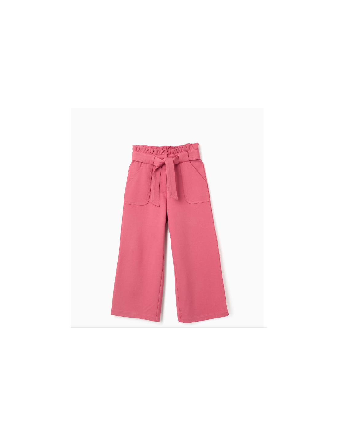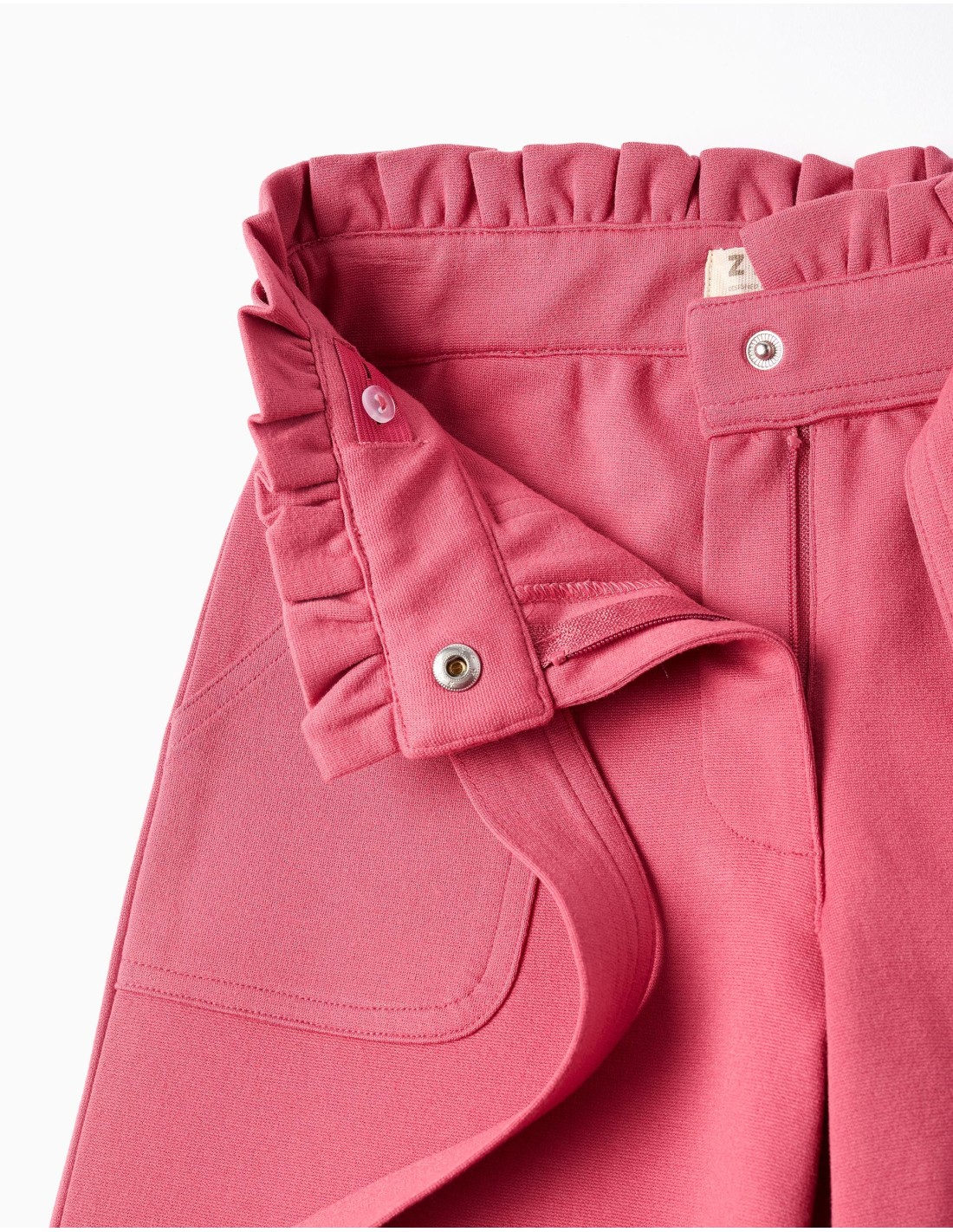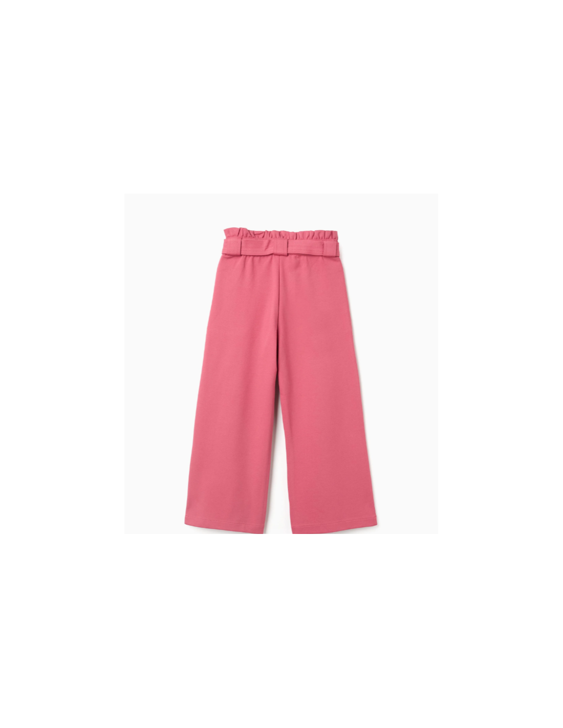 Pantalón rosa para niña, en punto Roma. Wide leg, modelo ancho y relajado. Cintura paperbag con volantes, ajustable en el interior con elásticos y botones. Con cinturón. Bolsillos laterales. Big Me: cierre con automáticos bajo botón decorativo hasta la talla 8/9, para facilitar el vestir y favorecer la autonomía del niño.