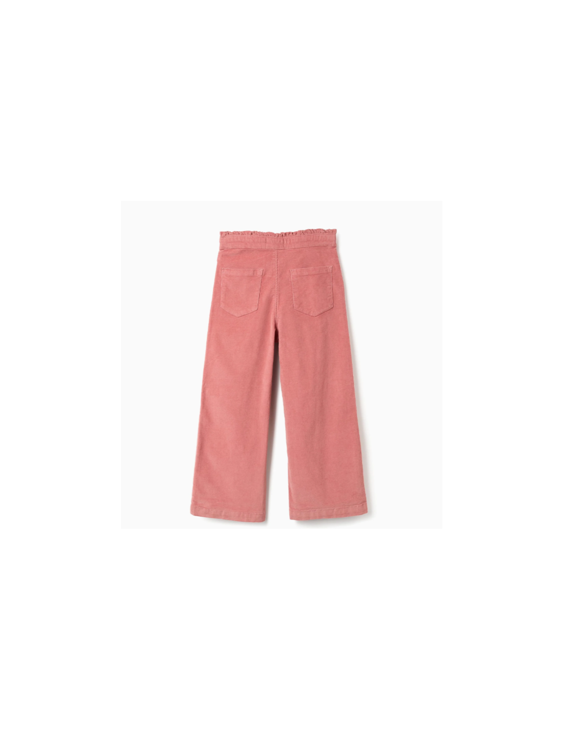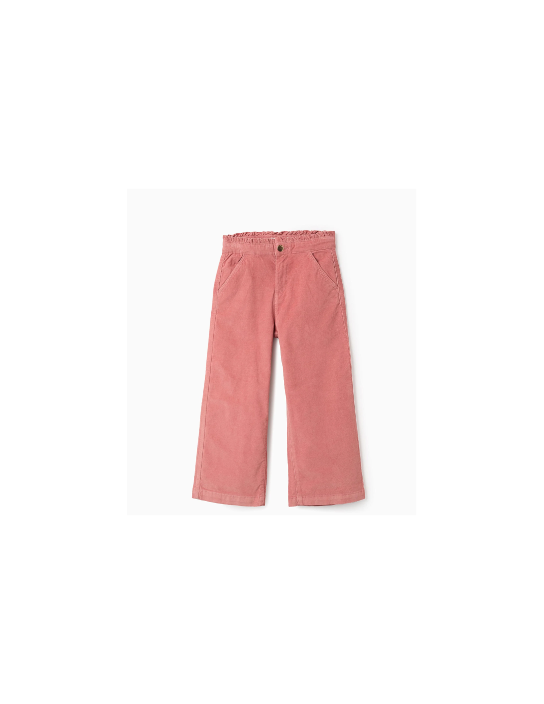 Pantalón rosa para niña, de pana de algodón con un toque de elasticidad para mayor comodidad y libertad de movimientos. Modelo de pernera ancha. Cuatro bolsillos. Cintura con volantes, ajustable en el interior con elásticos y botones. Para looks de otoño-invierno coloridos y a la moda. Big Me: se abrocha con un botón a presión bajo un botón decorativo hasta la talla 8/9, para facilitar el vestido y favorecer la autonomía de tu hijo