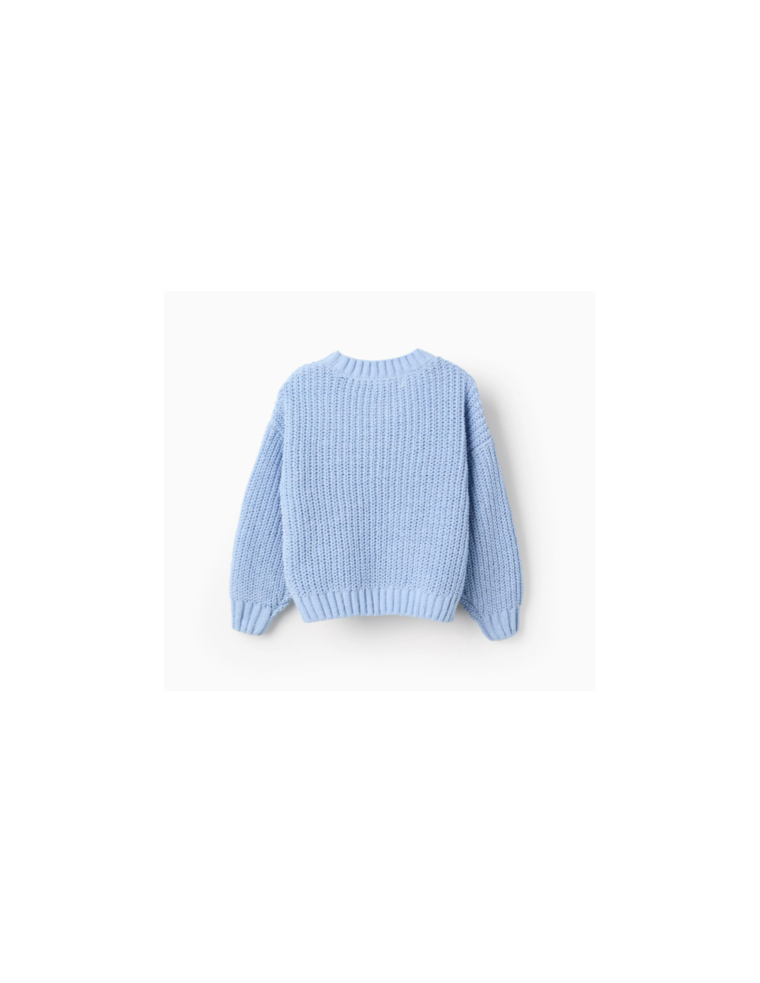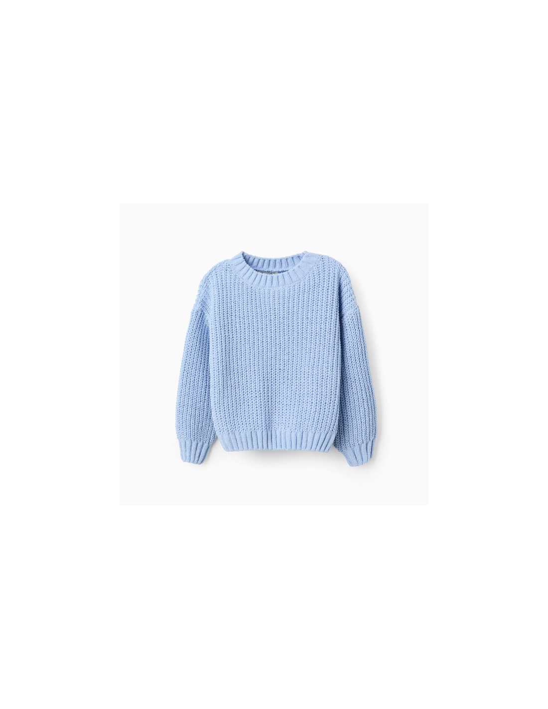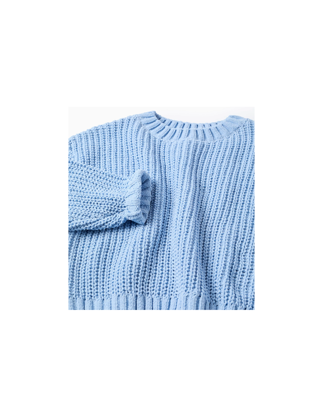 Jersey de punto de chenille azul para niña, suave y flexible. Hombros caídos y extremos acanalados. Corte amplio y relajado.