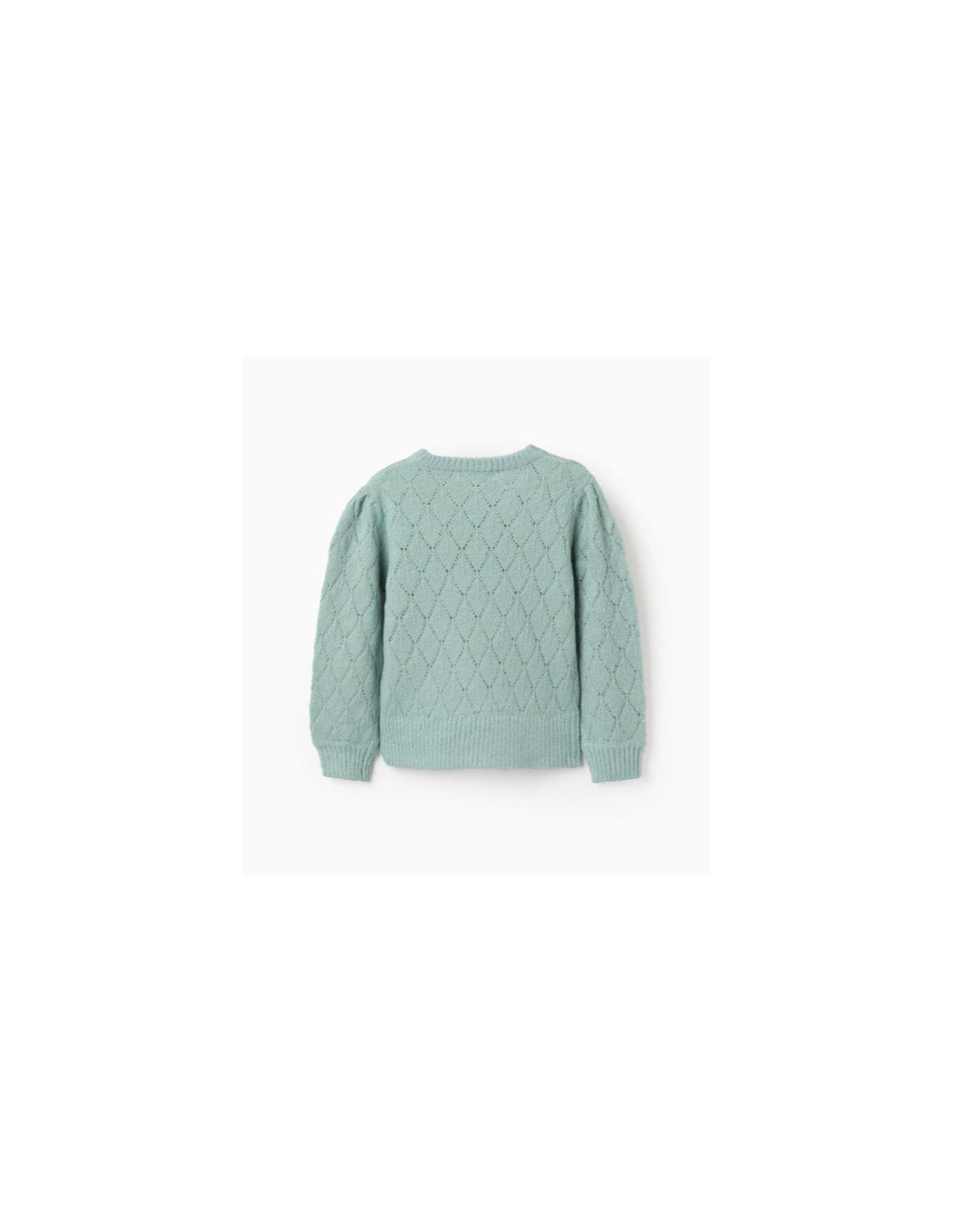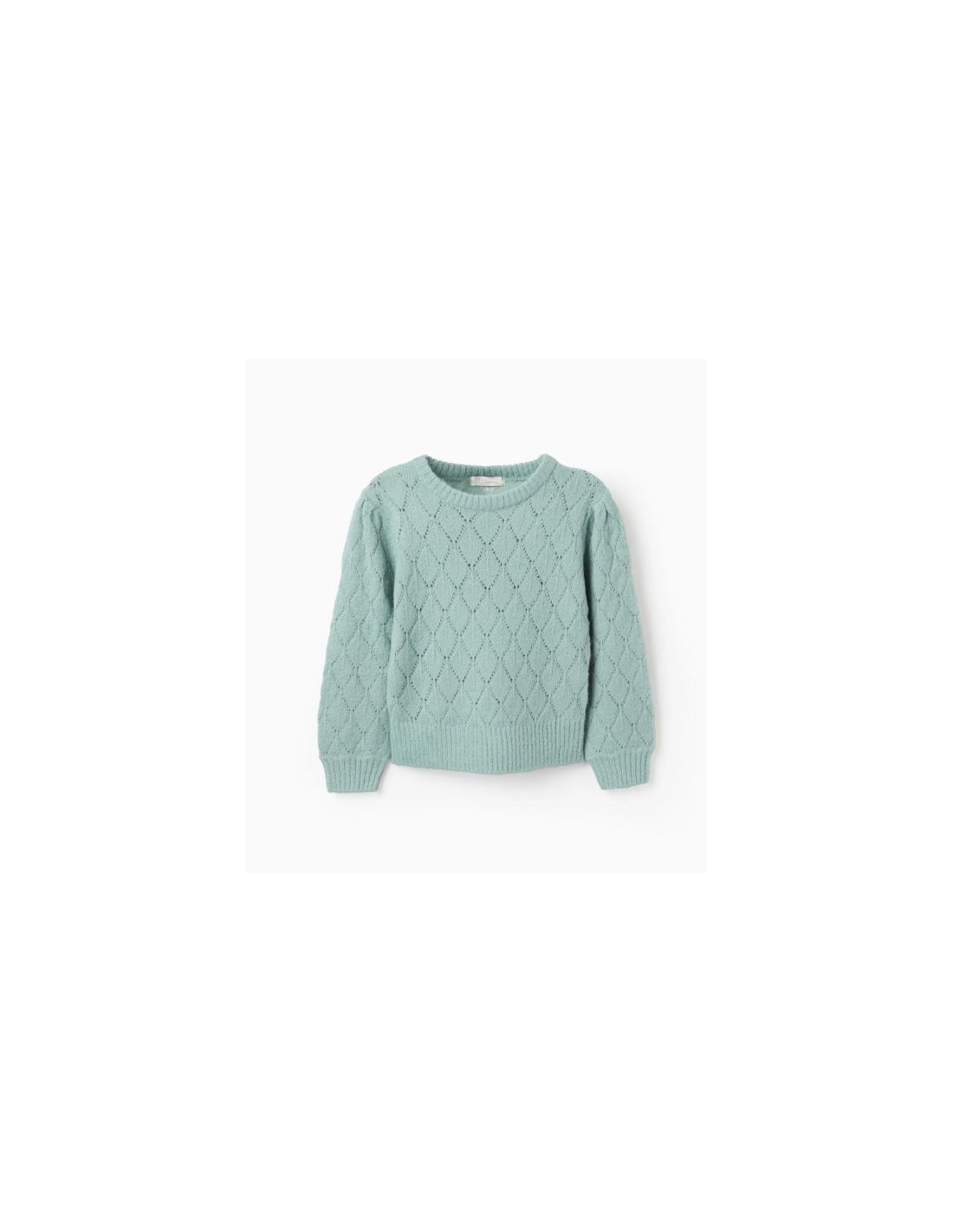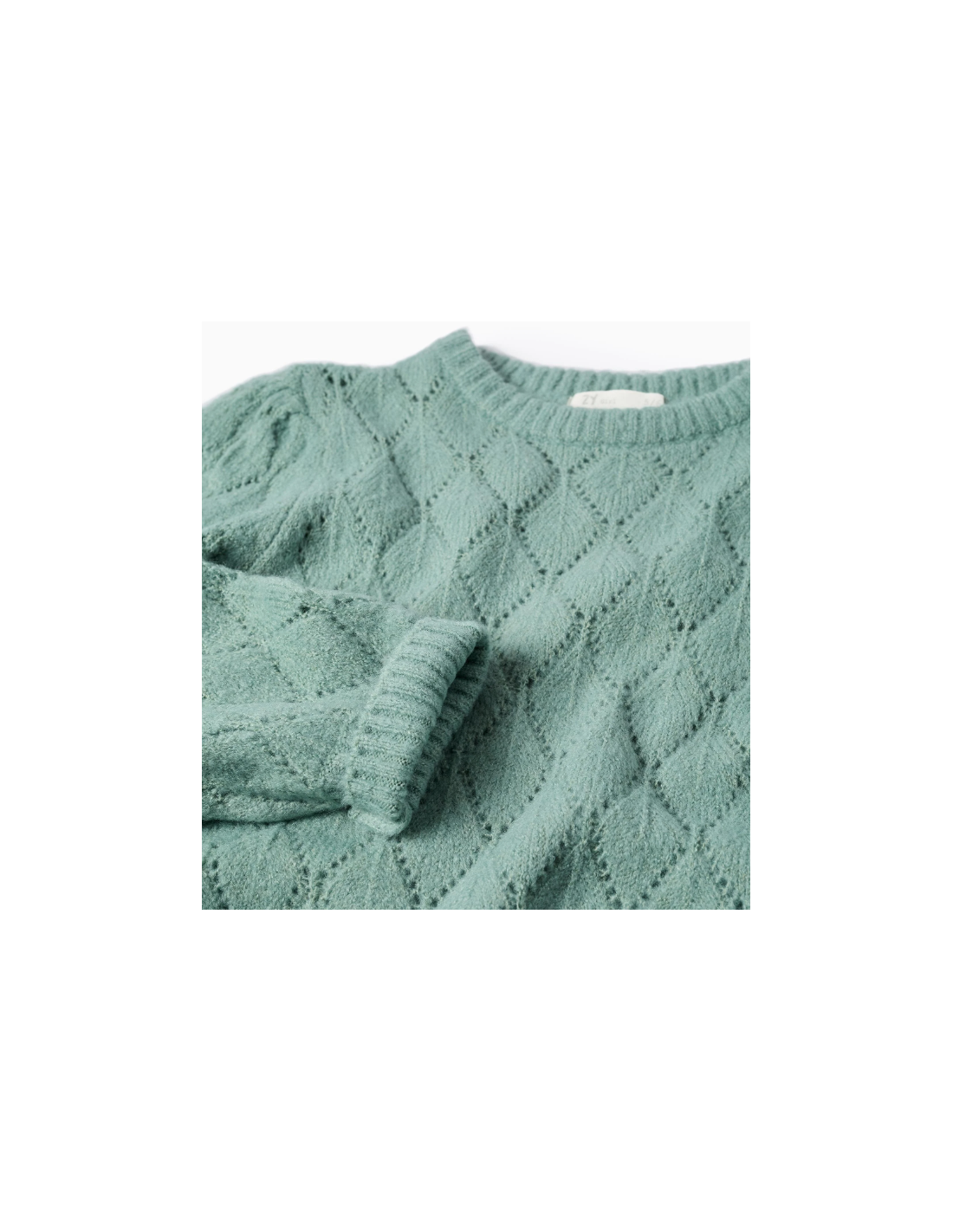 Jersey de punto calado verde para niña, suave y cómodo. Hombros caídos y mangas ligeramente abullonadas. Puños acanalados para un ajuste perfecto. ¡El jersey perfecto para los días de cole!