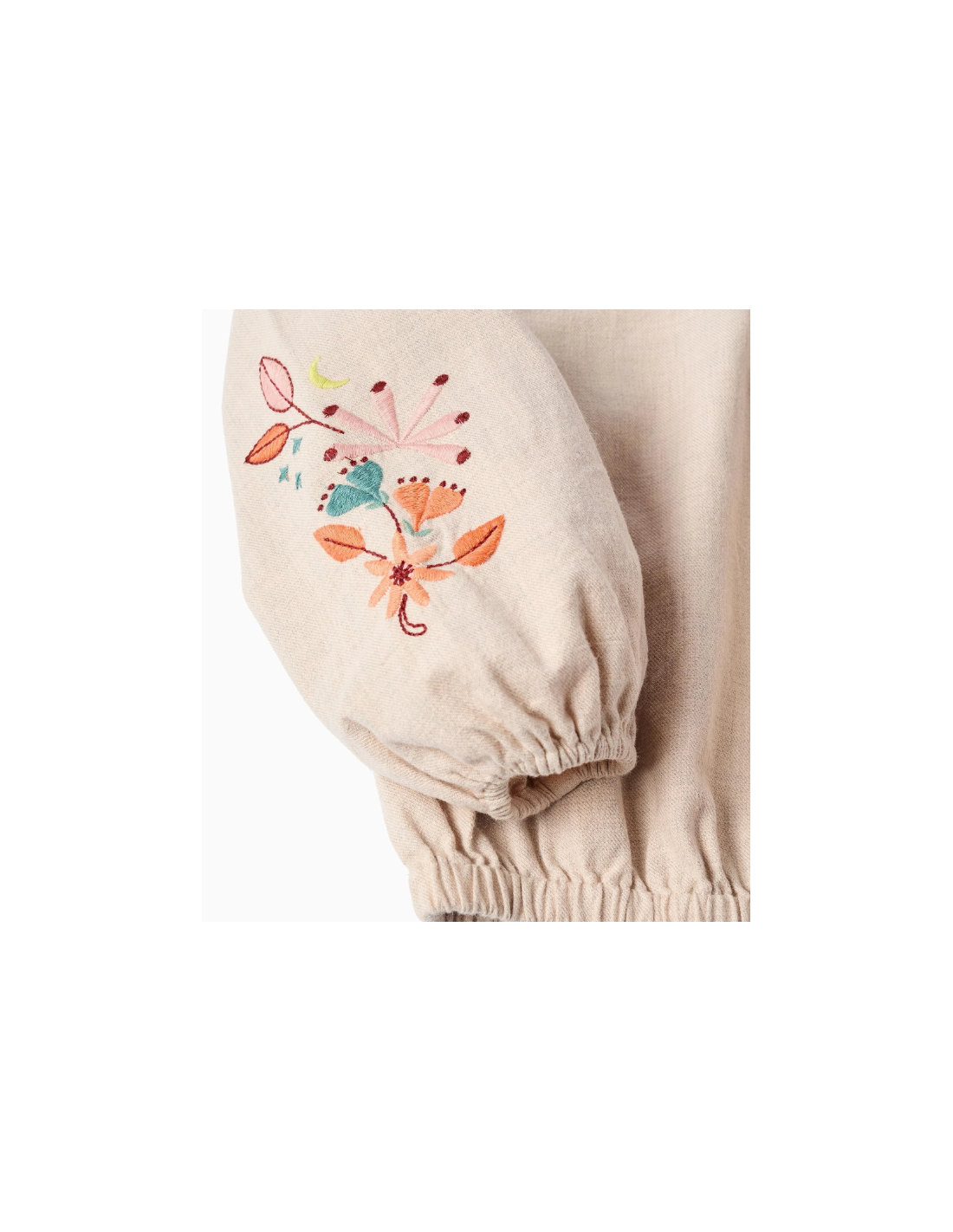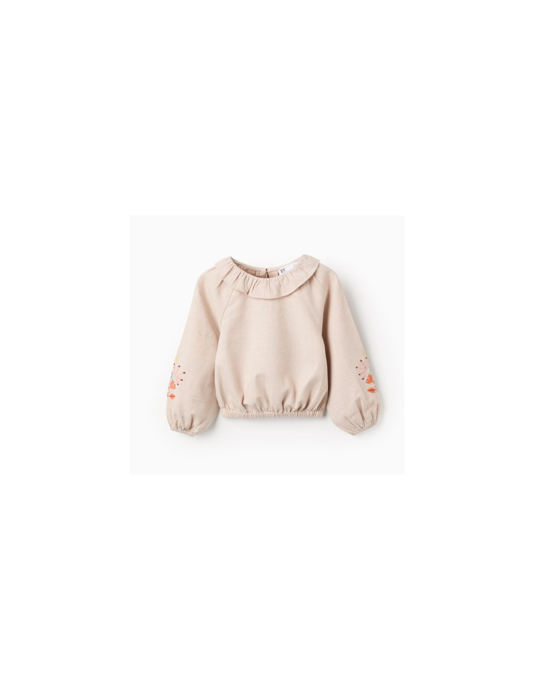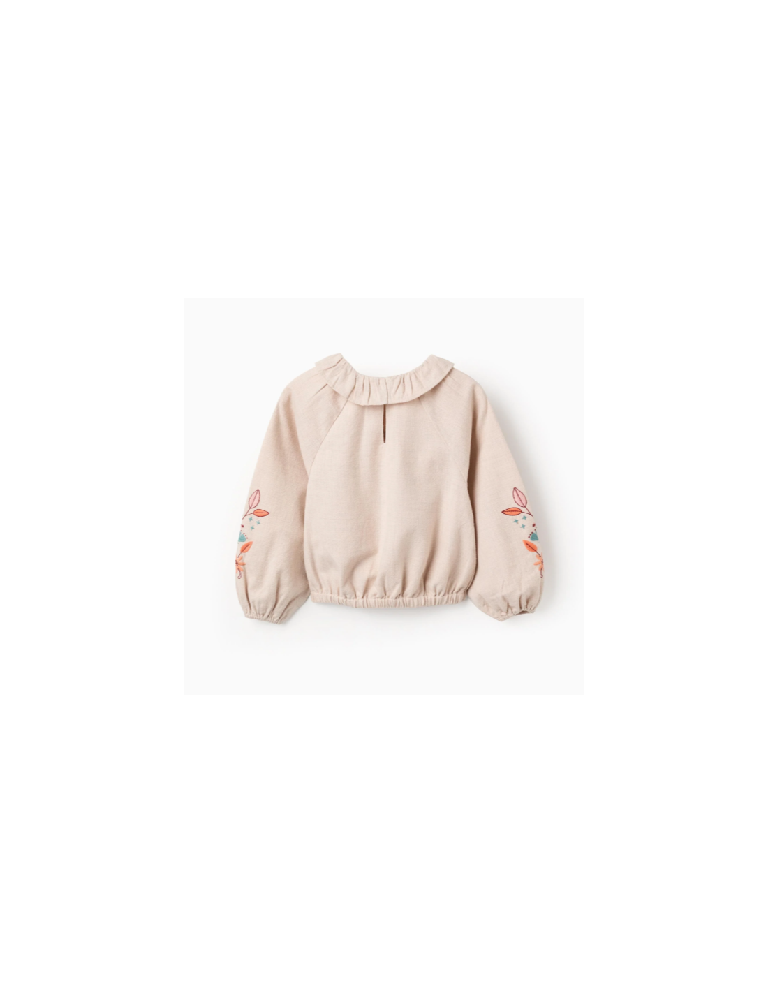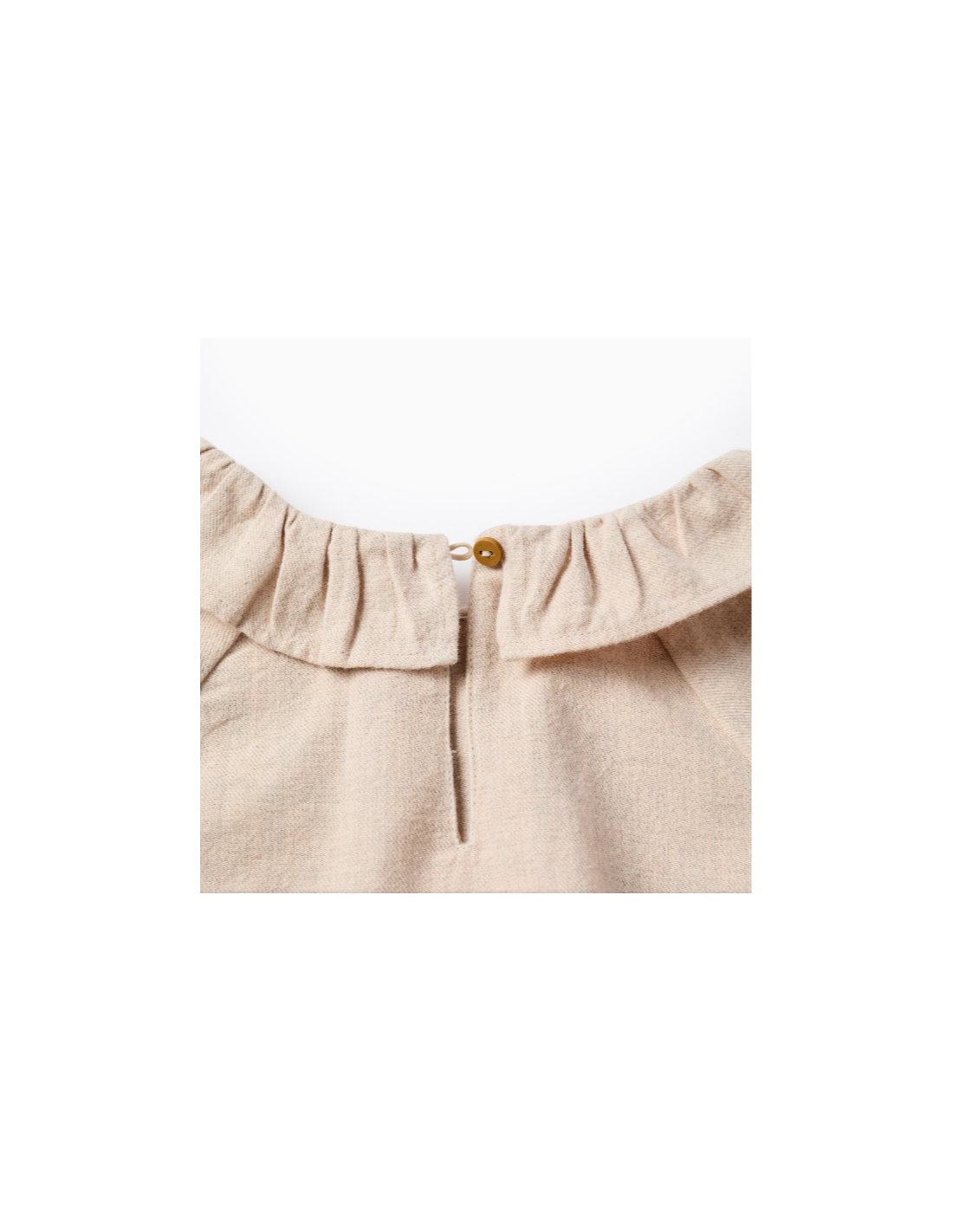 Blusa de niña en sarga beige con cuello de volantes. Mangas raglán acampanadas con bordado de flores. Cierre con botones en la espalda. Bajo elástico para un ajuste perfecto y un look original.