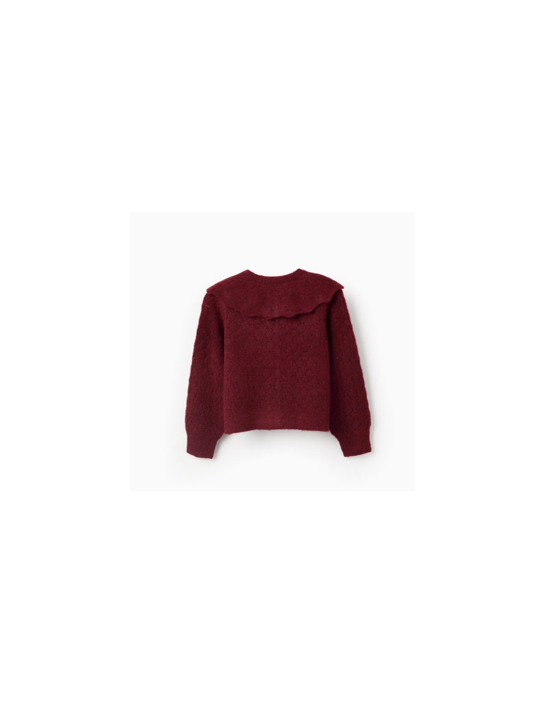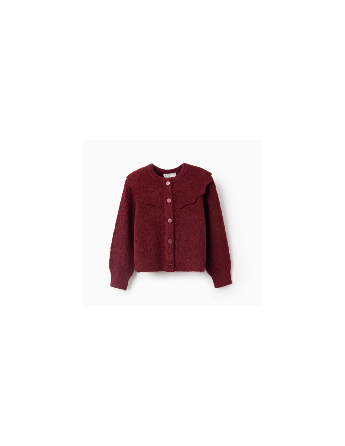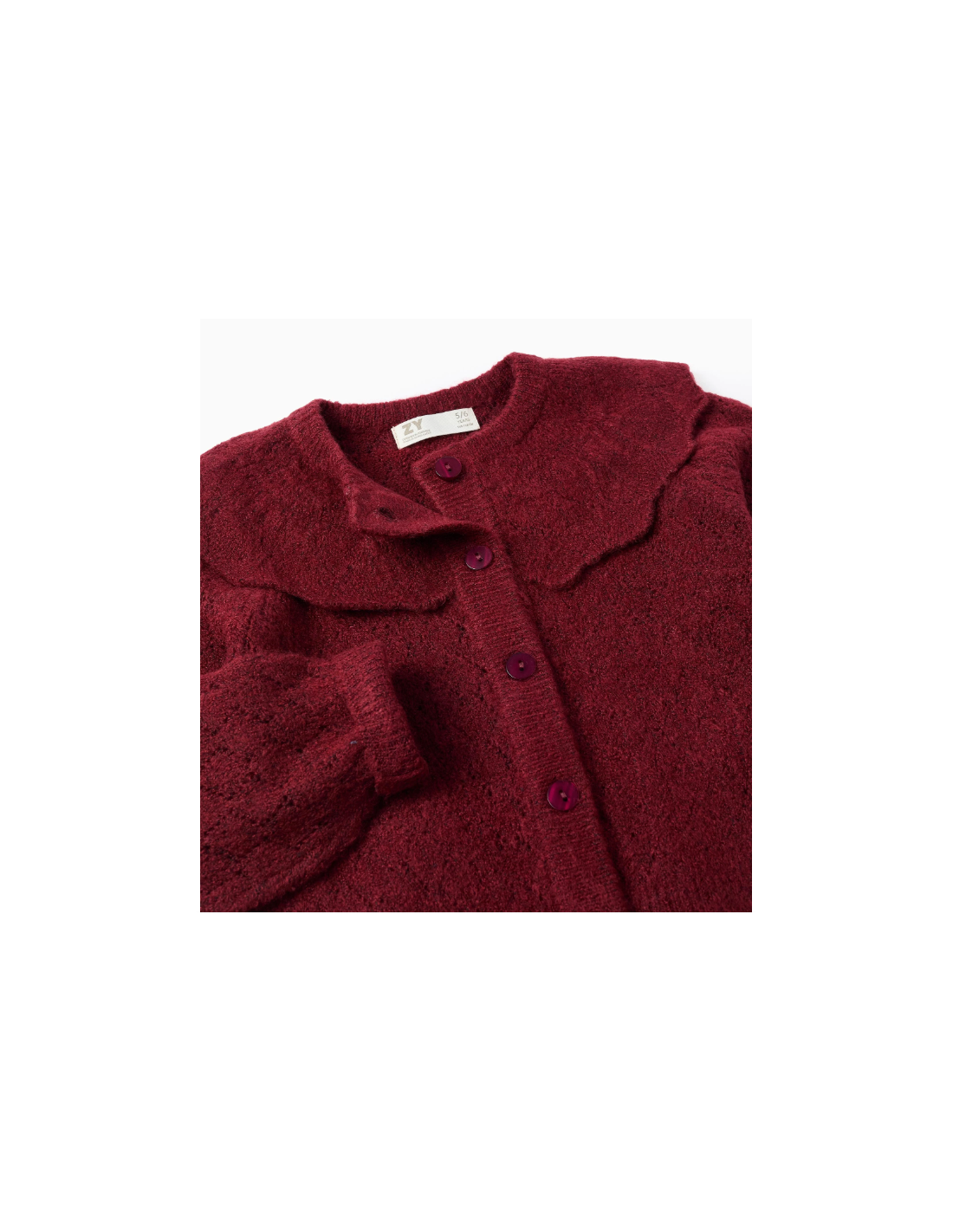 Chaqueta de punto calado con cuello de volantes para niña, burdeos
