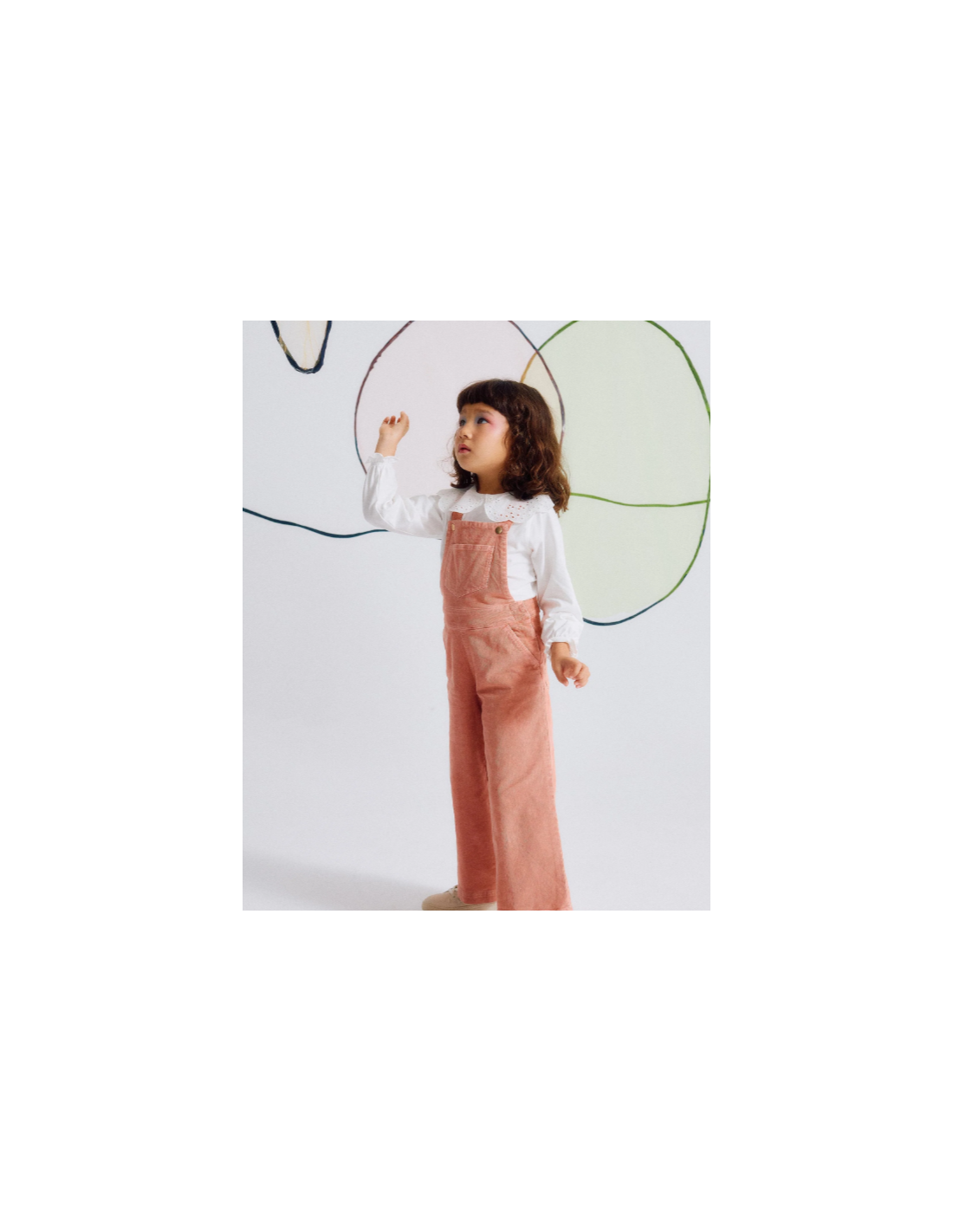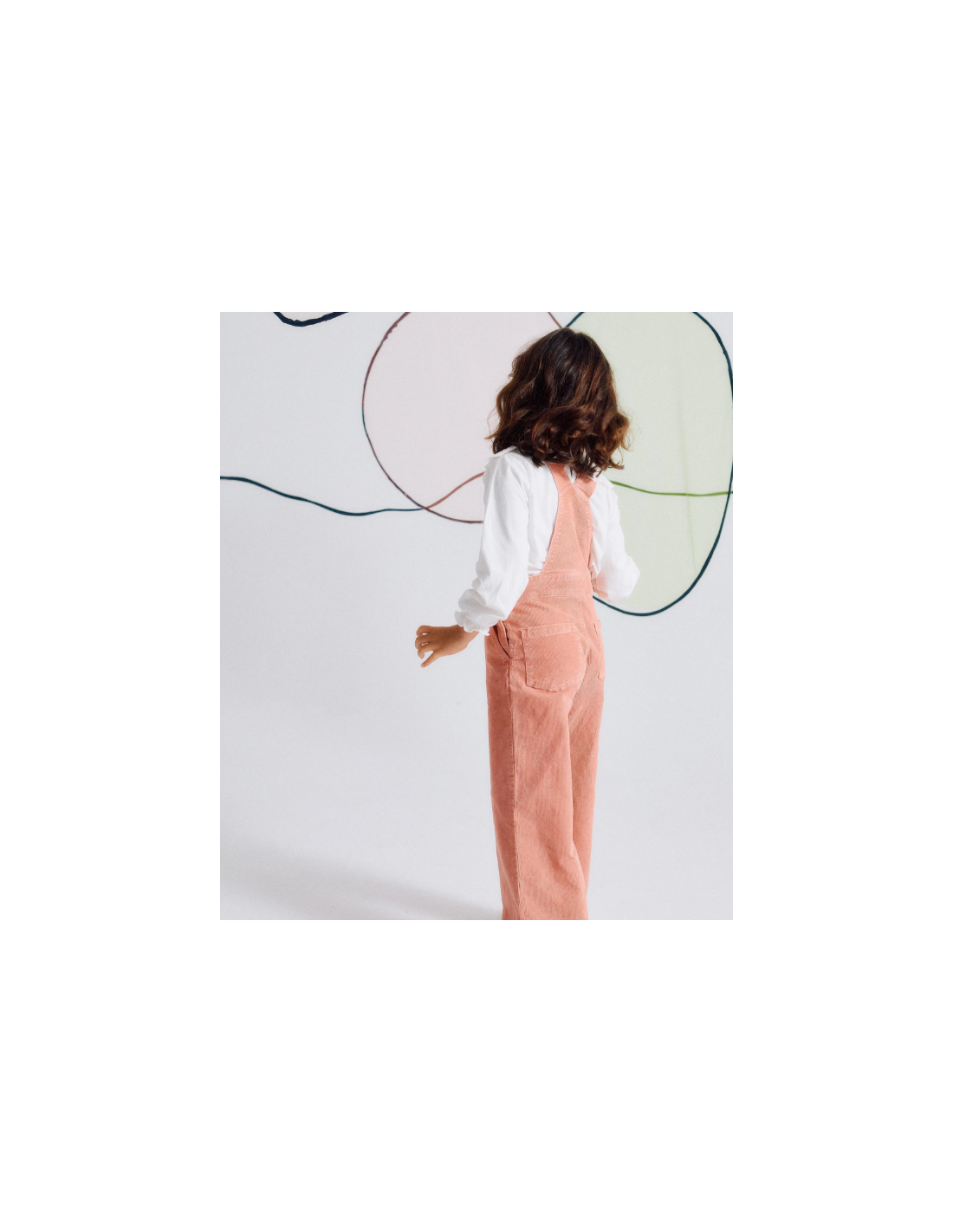 Peto rosa wide leg para niña, en pana de algodón con un toque de elasticidad para mayor comodidad y libertad de movimientos. Tirantes ajustables. Cinco bolsillos. Cintura interior ajustable con elástico y botones. Para looks de otoño-invierno coloridos y a la moda. Big Me: se abrocha con un botón a presión bajo un botón decorativo hasta la talla 8/9, para facilitar el vestido y favorecer la autonomía de tu hijo.