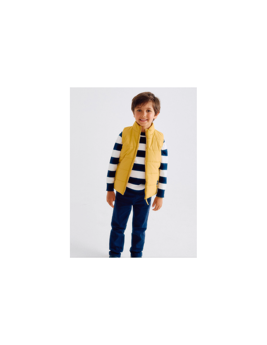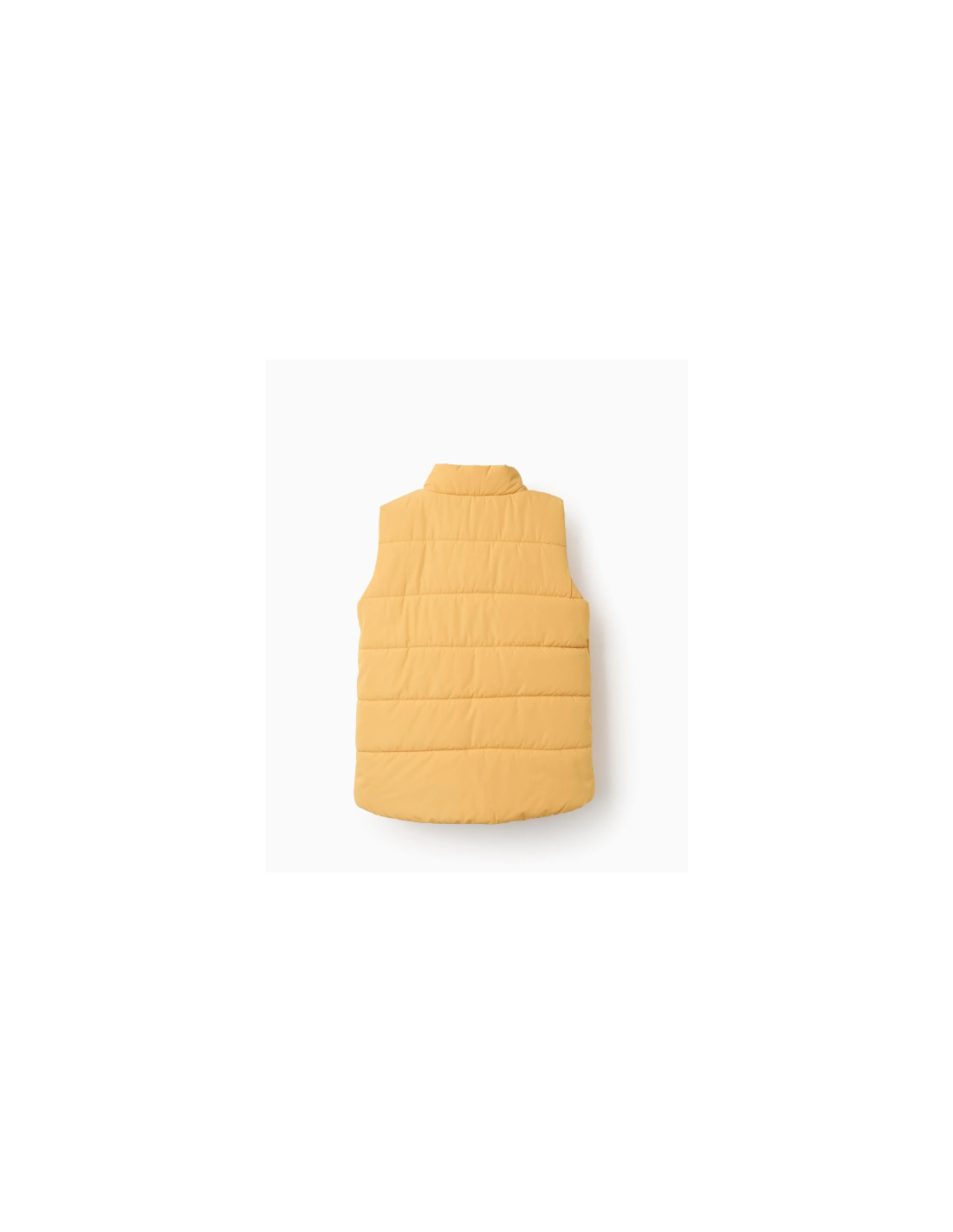 Chaleco acolchado amarillo de niño con forro polar para mayor calidez. Cuello semialto. Cierre con cremallera para vestirse fácilmente. Bolsillos laterales. Etiqueta interior para la identificación del niño. Una prenda versátil y cómoda, perfecta para los días más frescos. We Care: esta prenda está rellena de poliéster reciclado.