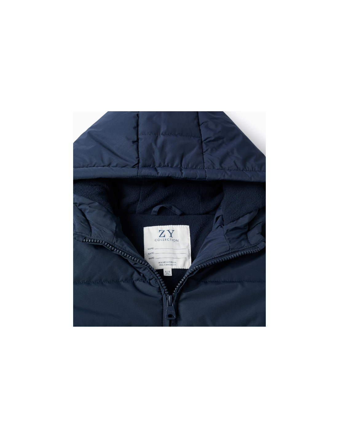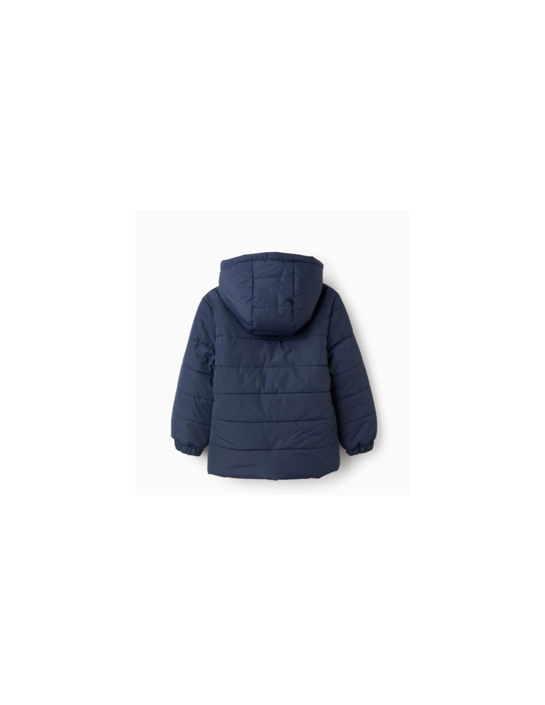 Chaqueta acolchada azul oscuro para niño, con capucha y forro polar para máximo confort térmico. Bolsillos laterales. Puños elásticos para un ajuste perfecto. Etiqueta interior para poner el nombre del niño. ¡Un esencial del invierno! We Care: el relleno de esta prenda está compuesto por poliéster reciclado.
