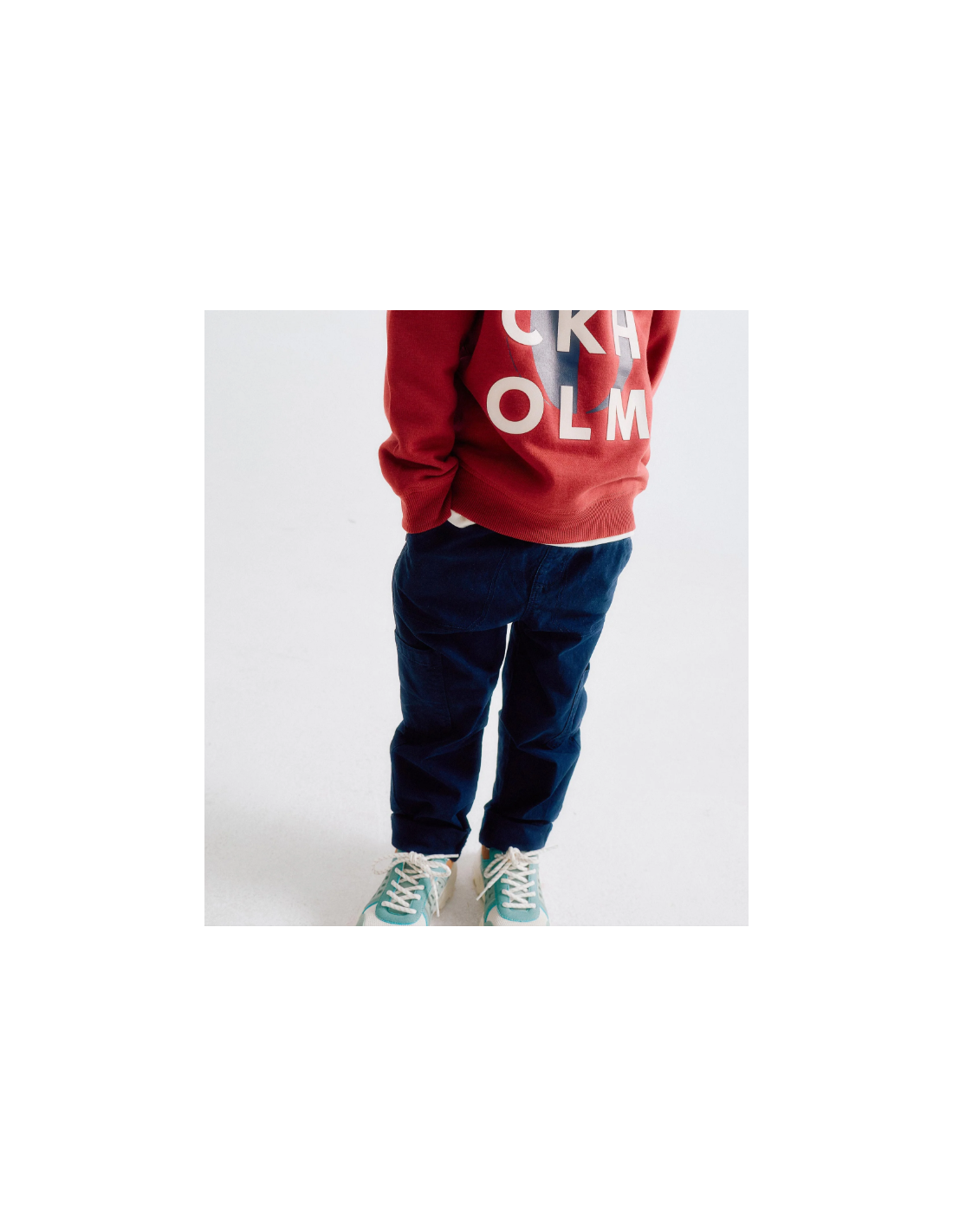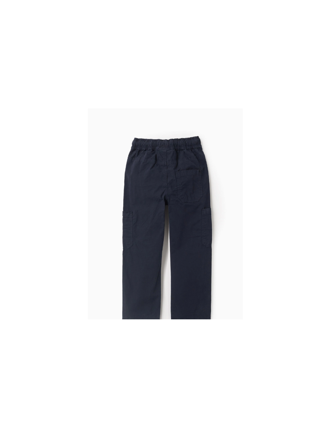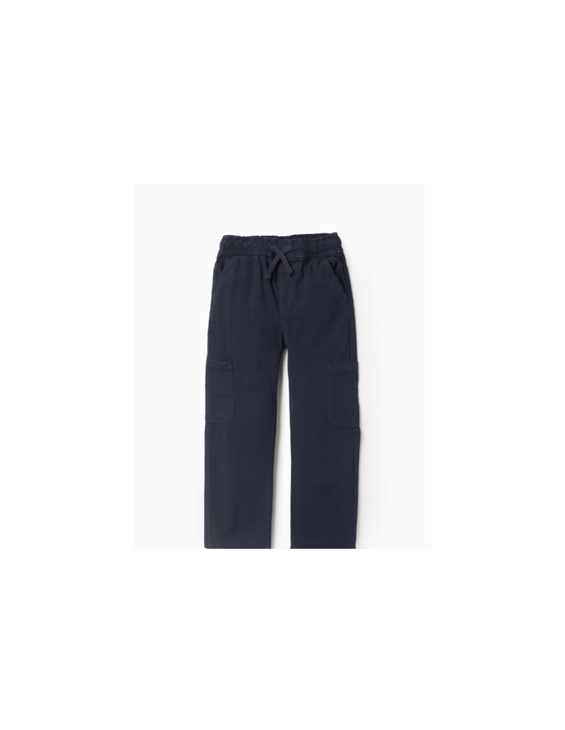 Pantalón azul oscuro con bolsillos cargo para niño. Corte recto. Cintura elástica con cordón de ajuste. Dos bolsillos laterales, un bolsillo trasero y dos bolsillos cargo. Ideal para looks informales y deportivos.
