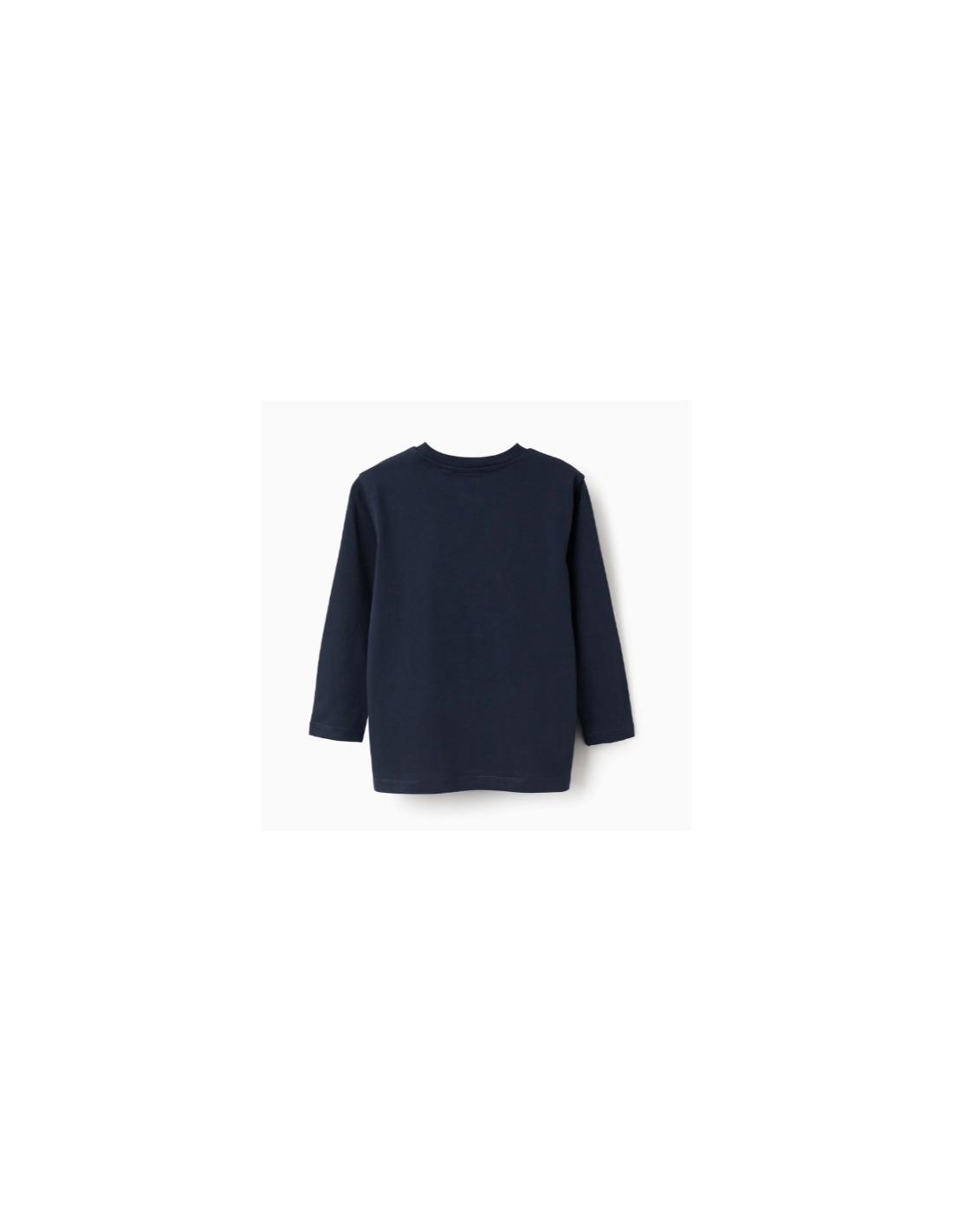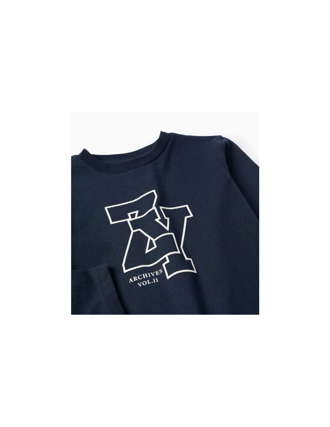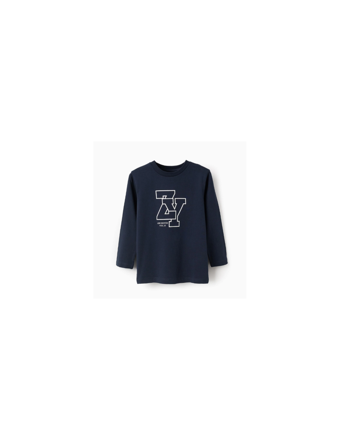 Camiseta azul oscuro de manga larga para niño, 100 % algodón. Estampado ZY en la parte delantera. Etiqueta interior impresa para no irritar la piel. Una opción versátil para todos los estilos.