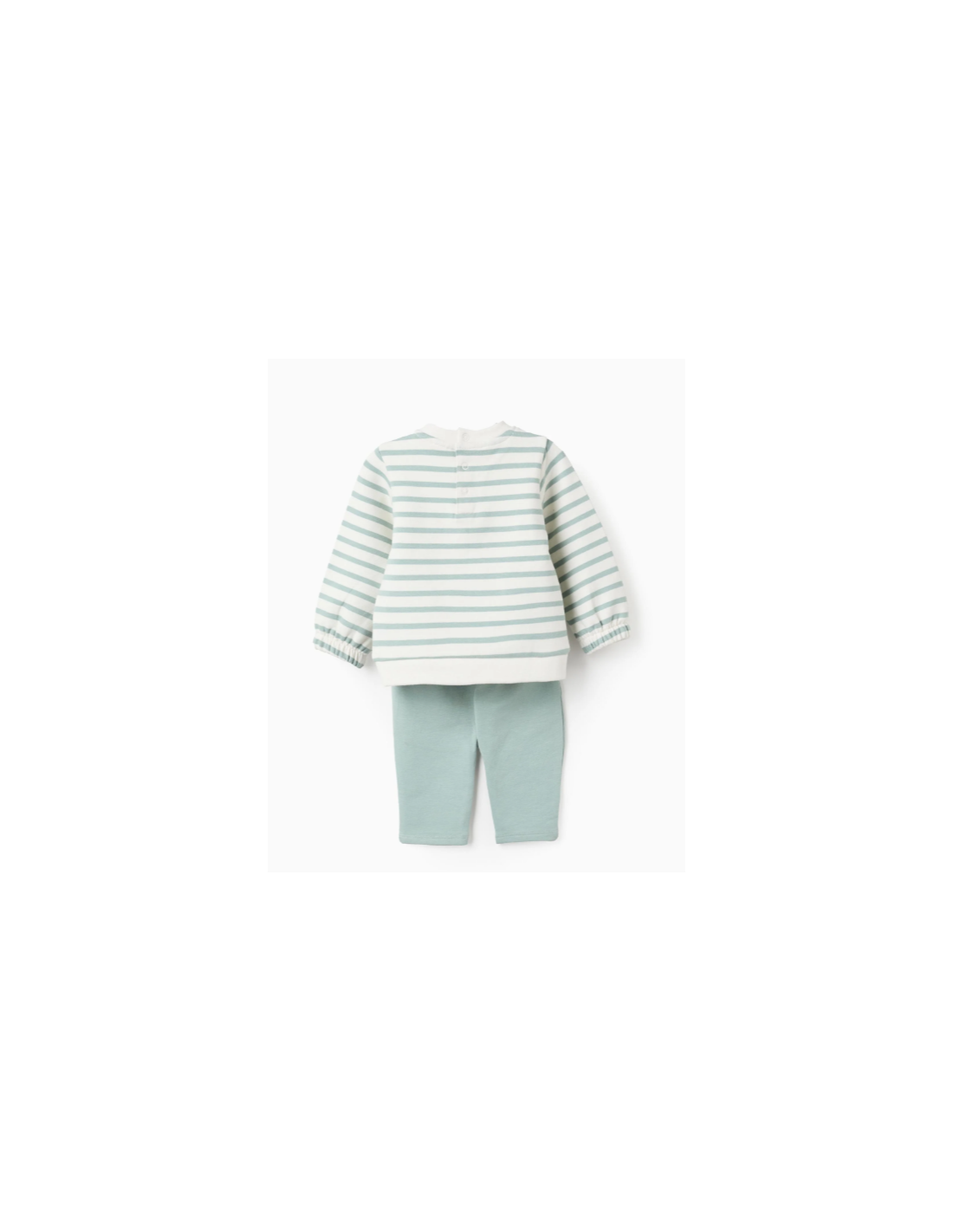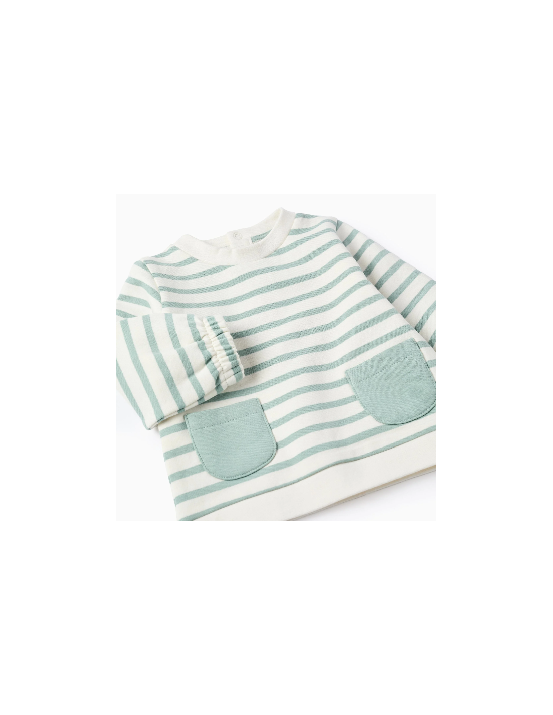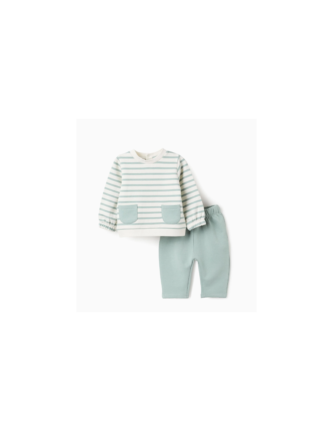 Conjunto de dos piezas para recién nacida, con interior perchado para mayor confort térmico. Incluye una sudadera a rayas con bolsillos delanteros y un pantalón verde agua con una cómoda cintura elástica. ¡Un conjunto adorable para llevar juntos o incluso para combinar con otras prendas