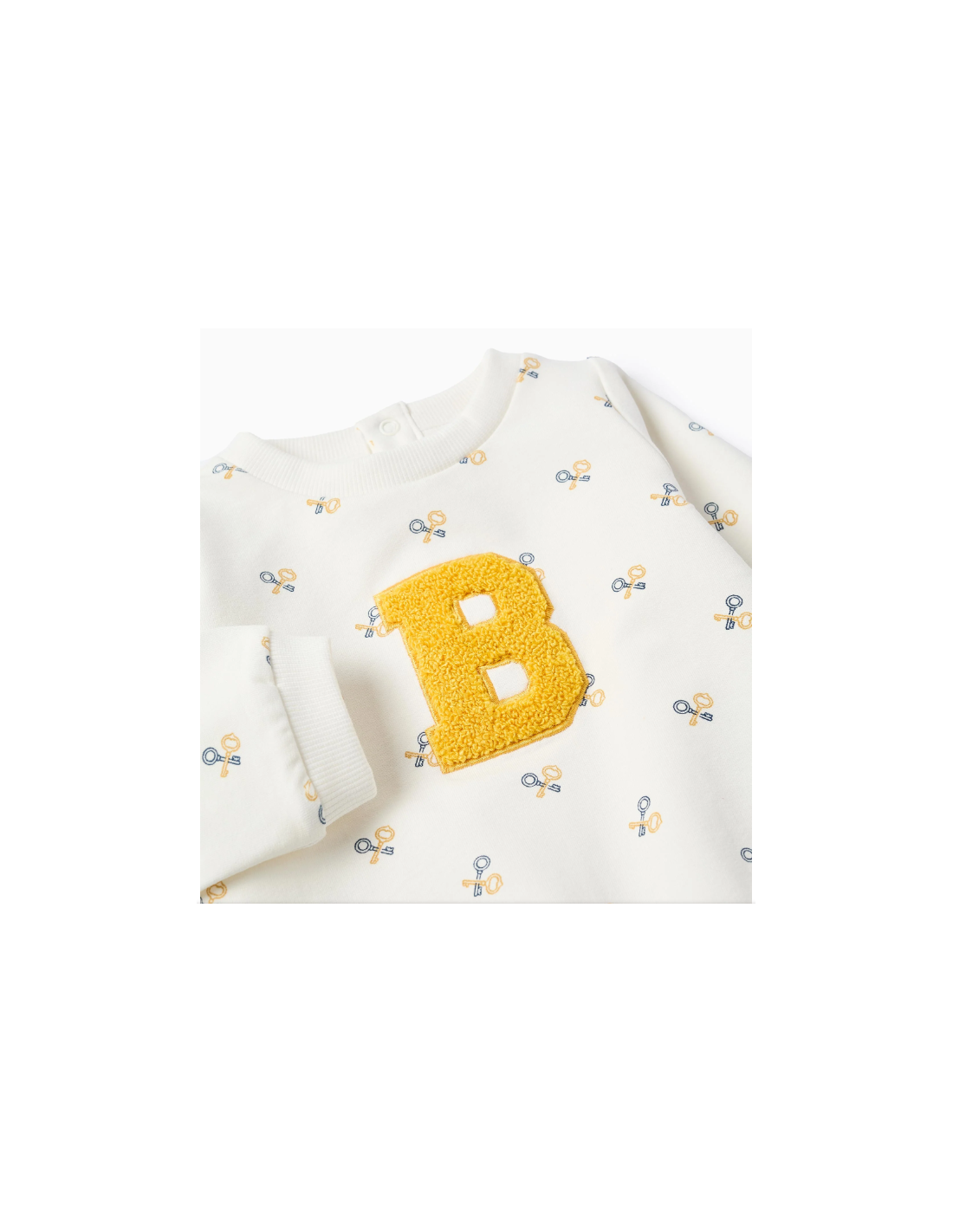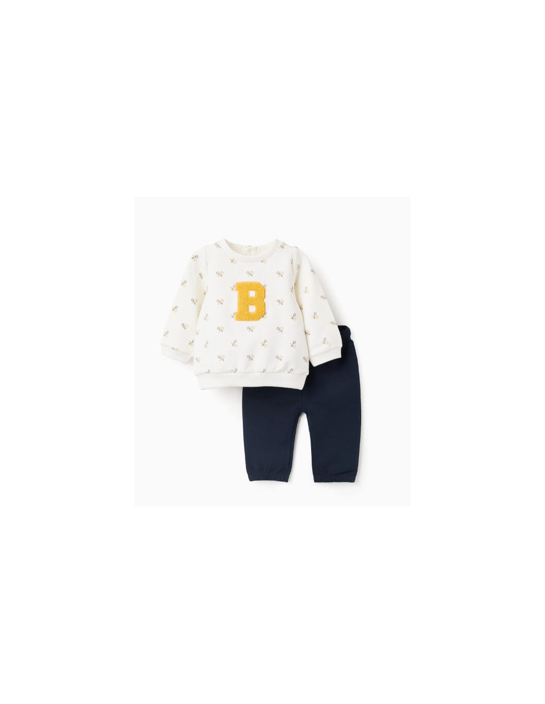 Chándal de dos piezas para recién nacido, en algodón con un toque de elasticidad para mayor comodidad y libertad de movimientos. Incluye una sudadera blanca con motivo de llave y una B de bouclé en la parte delantera. Botones automáticos en la espalda para vestirla fácilmente. Pantalón azul oscuro con cintura y bajos elásticos. Un conjunto práctico y cómodo para llevar juntos o por separado.