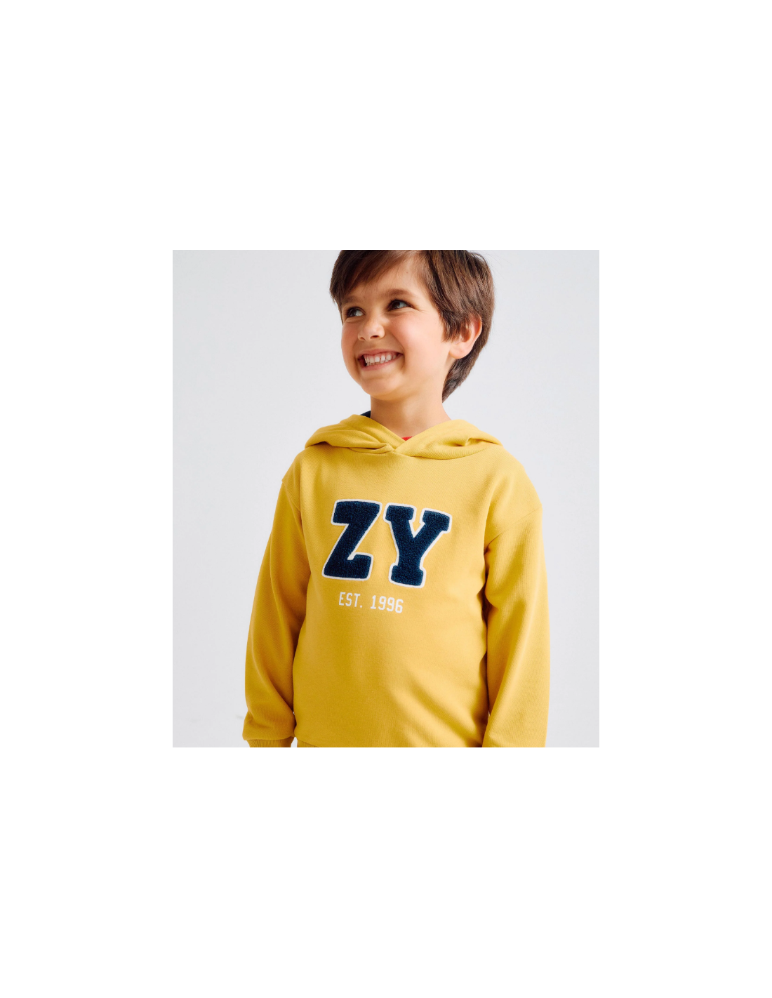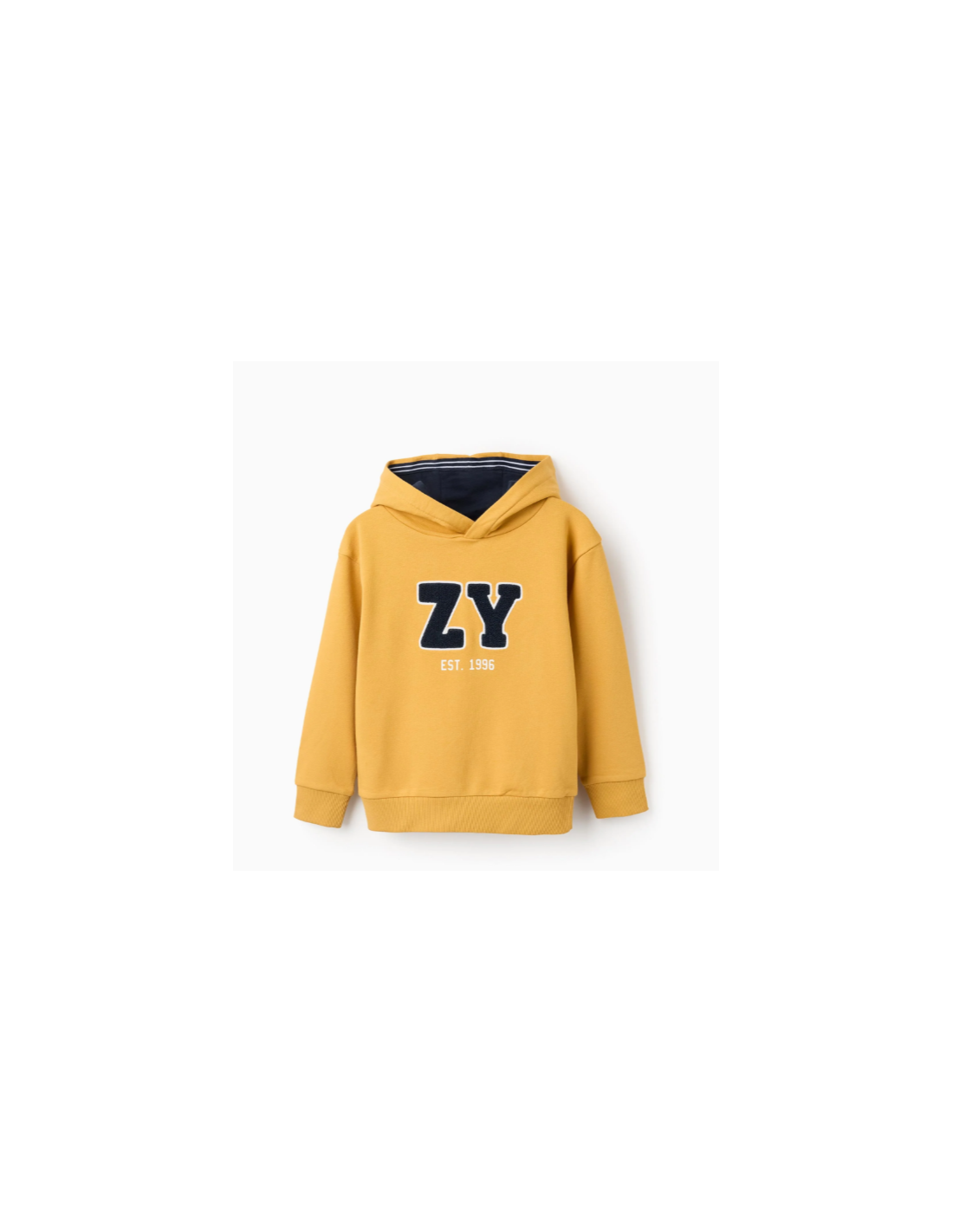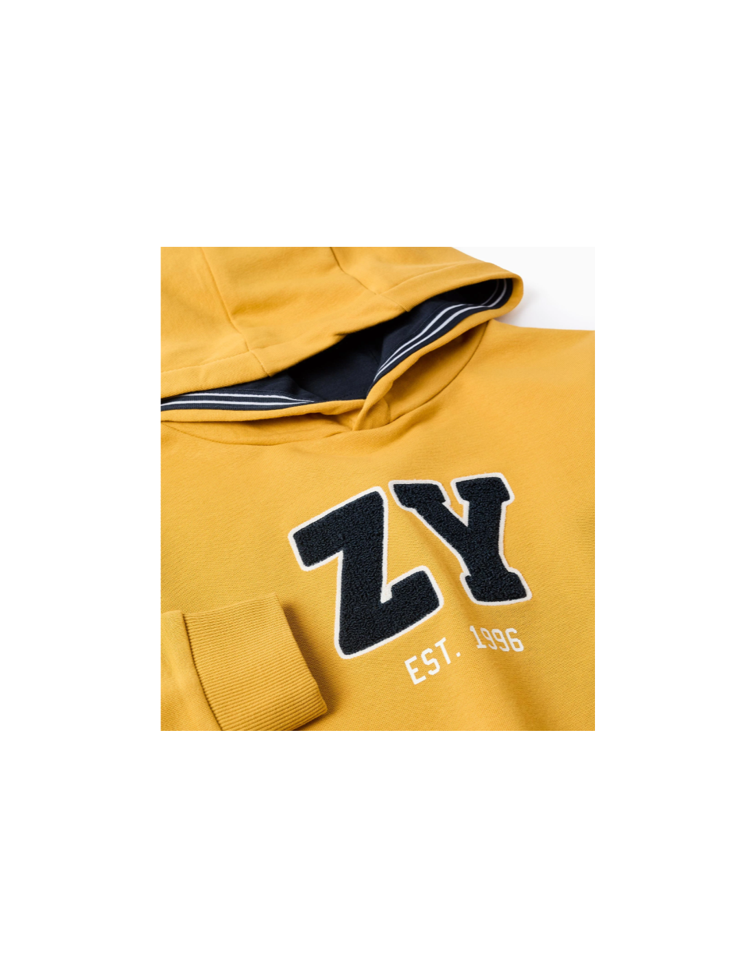 Sudadera con capucha amarilla para niño, en una suave y cómoda mezcla de algodón. Capucha forrada en jersey azul oscuro con contorno de rayas. Estampado en el pecho con el nombre de la marca ZY en bouclé azul oscuro. Bordes acanalados para un ajuste perfecto. Una opción práctica, ideal para llevar a diario.